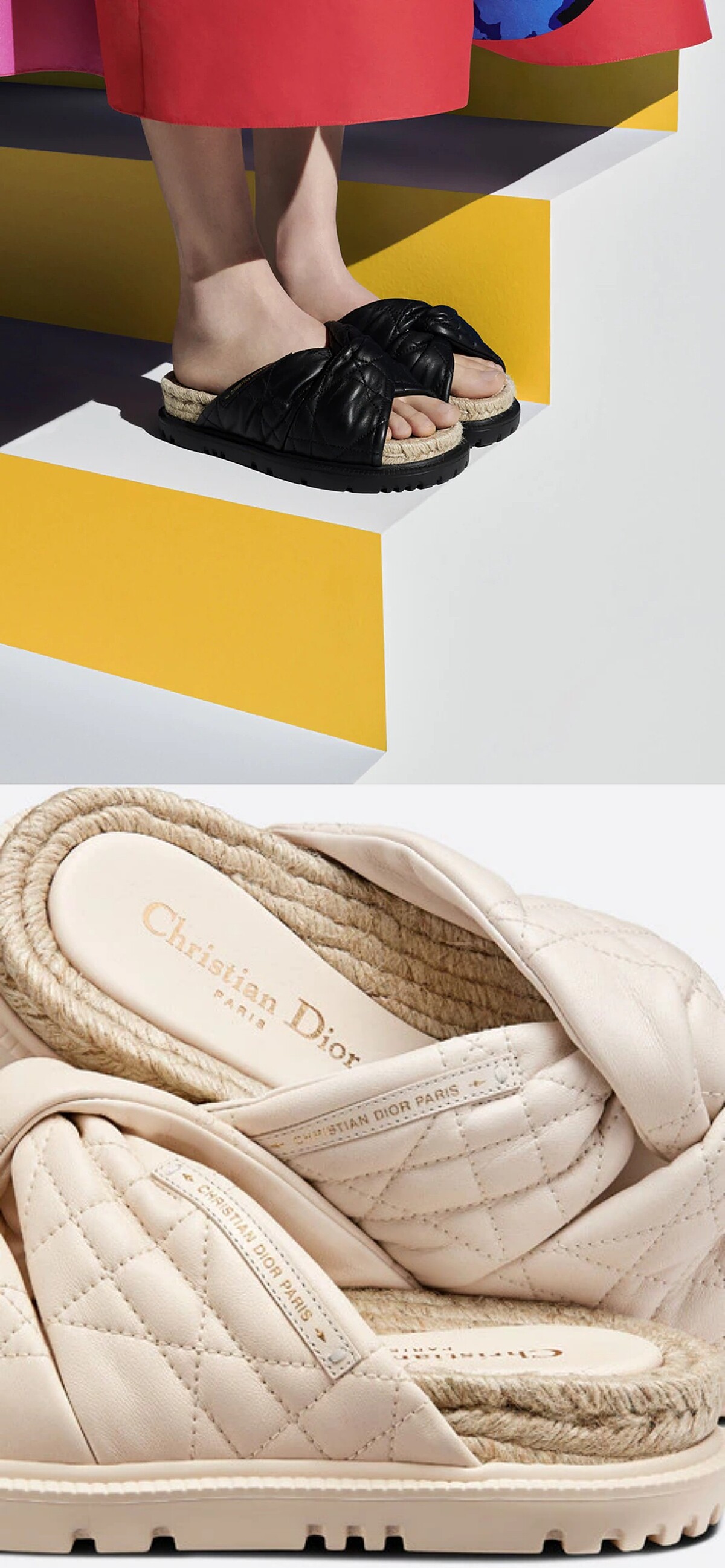 擷取Lady Dior包袋上最具辨識度的Cannage藤格紋皮料,將兩條皮革交錯出扭結作為鞋款主要亮點,低調綴上「CHRISTIAN DIOR PARIS」標誌,搭配草編與Eva鞋底,完美演繹夏日度假必備鞋款。