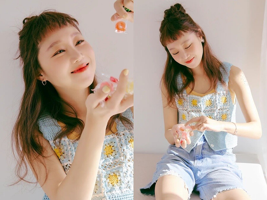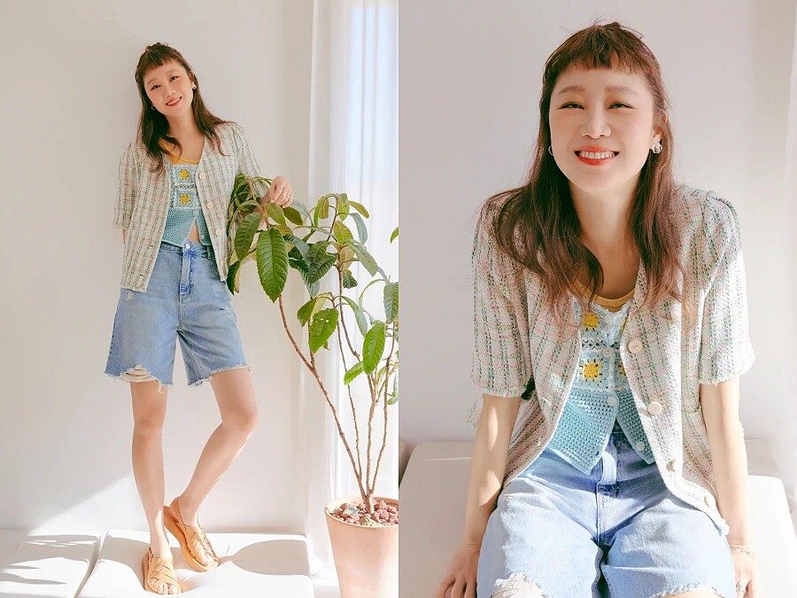 近兩年短褲不再流行迷你、露大腿的款式,取而代之是接近膝蓋的五分褲,孔曉振逆齡穿搭以亮黃色Bra Top與天空藍針織刺繡背心的撞色作搭配,整體看起來不只少10歲,還充滿活力。