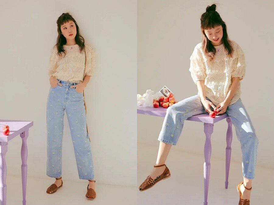 如果真的不愛短褲的話,那也可以像孔布利一樣選擇牛仔寬褲,不論是米白色的蕾絲刺繡上衣,或是把碎花洋裝當成長版罩衫,外頭再罩上針織背心,減齡效果毫無懸念,堪稱孔曉振獨門的逆齡穿搭。