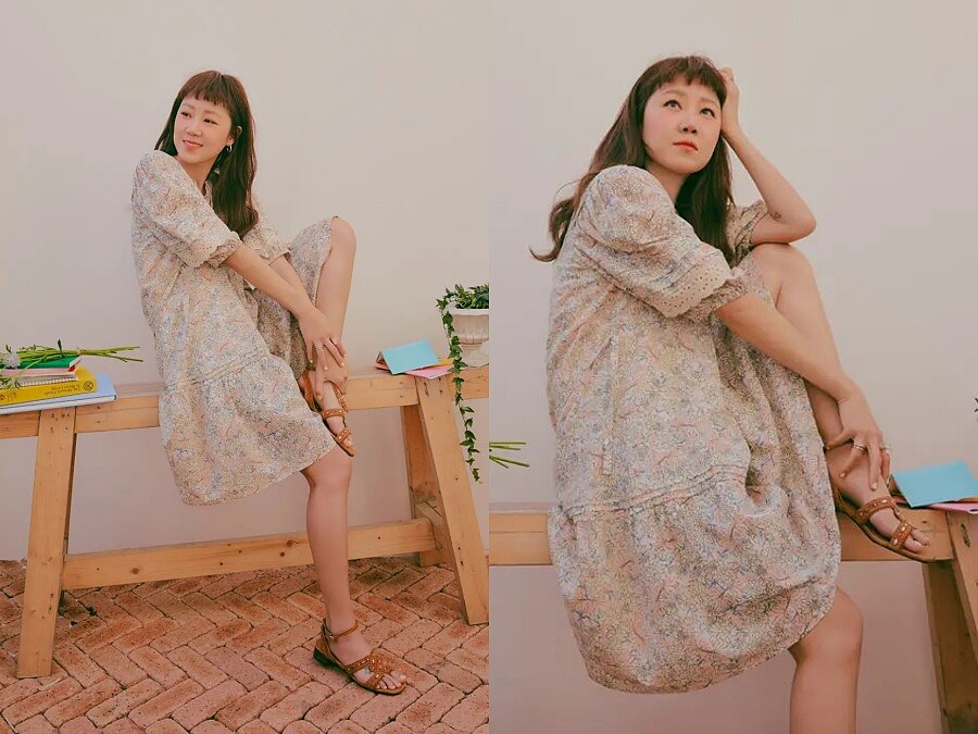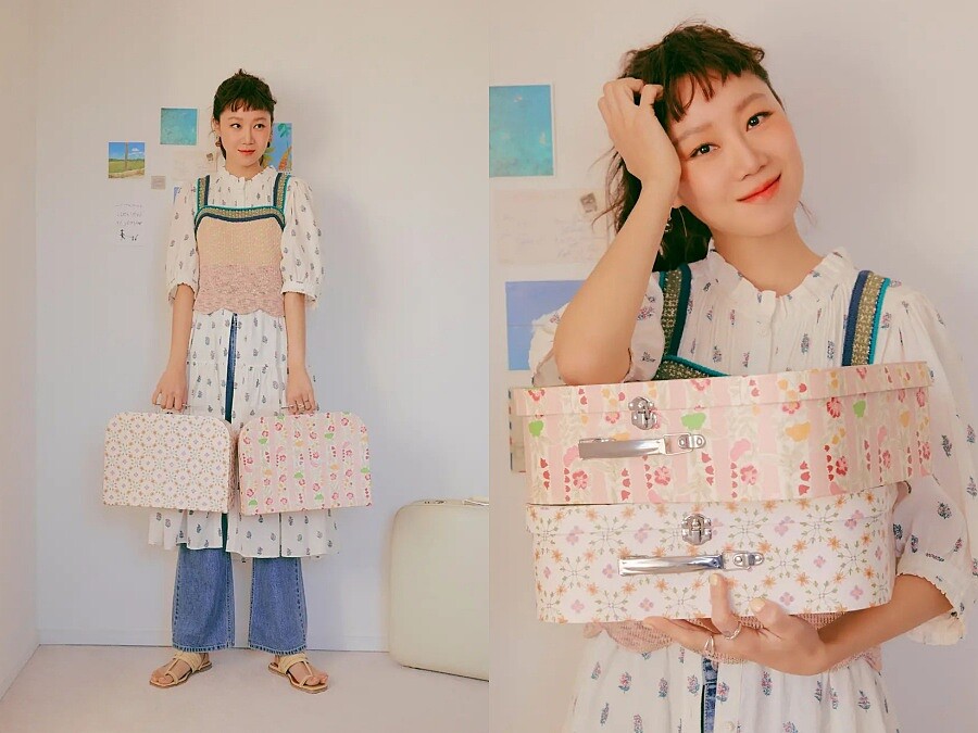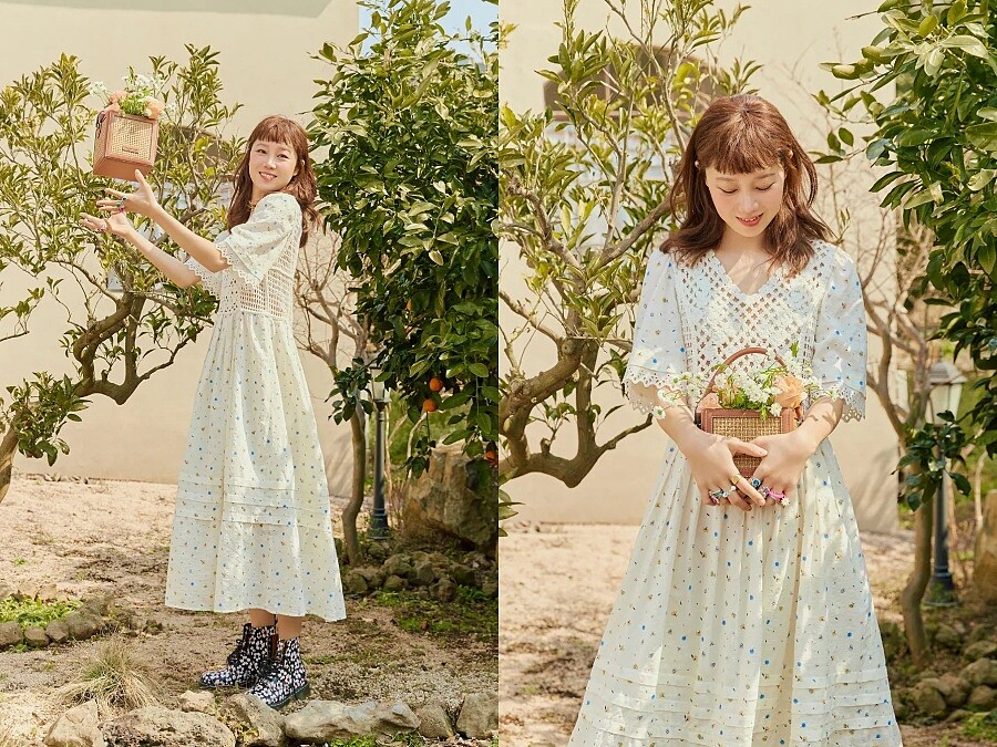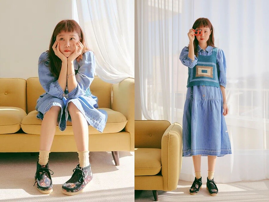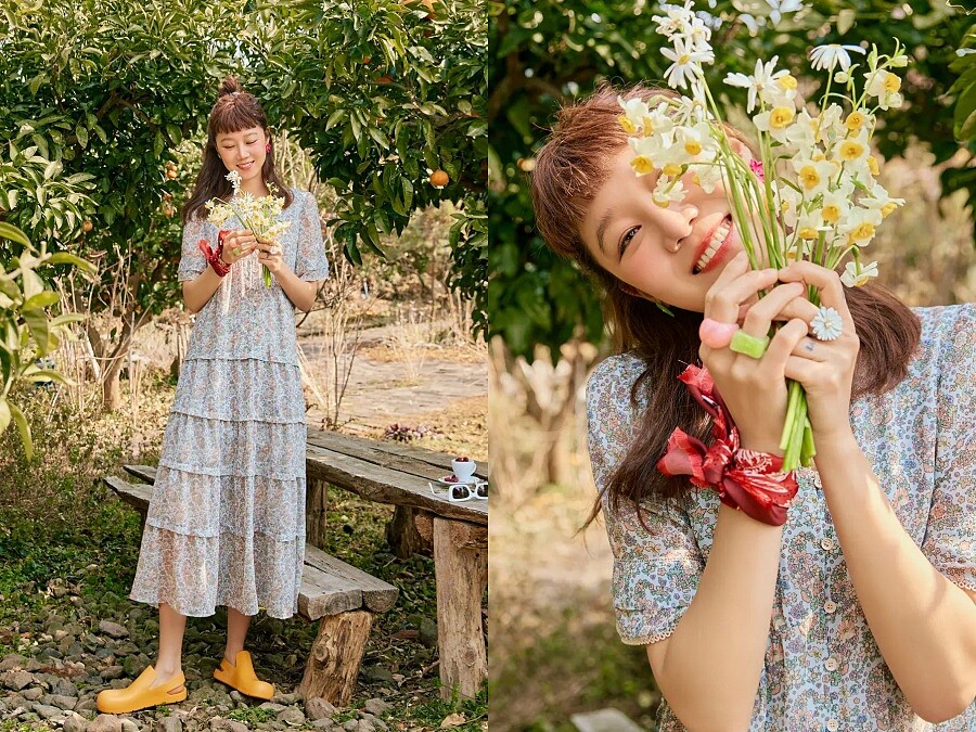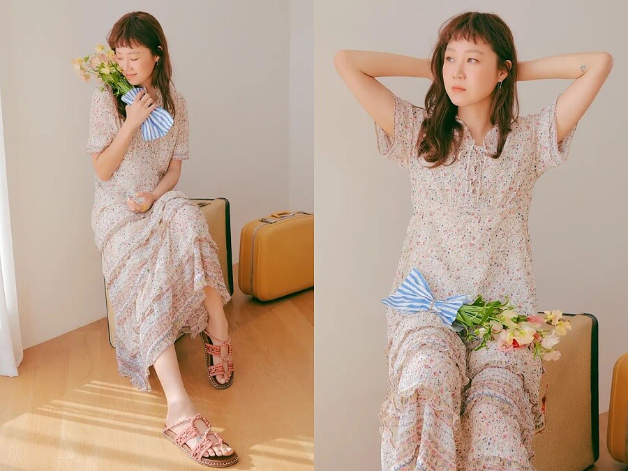 提到春夏必備的碎花洋裝,是學習孔曉振逆齡穿搭的首選,不過她在鞋款的選擇就比較不一樣,像是長到小腿的蕾絲拼接碎花洋裝,搭配又可愛又帥氣的印花馬汀靴、與碎花洋裝相似色的長靴、或是吸睛度十足的亮黃色布希鞋,以及最不容易出錯的羅馬涼鞋搭配。