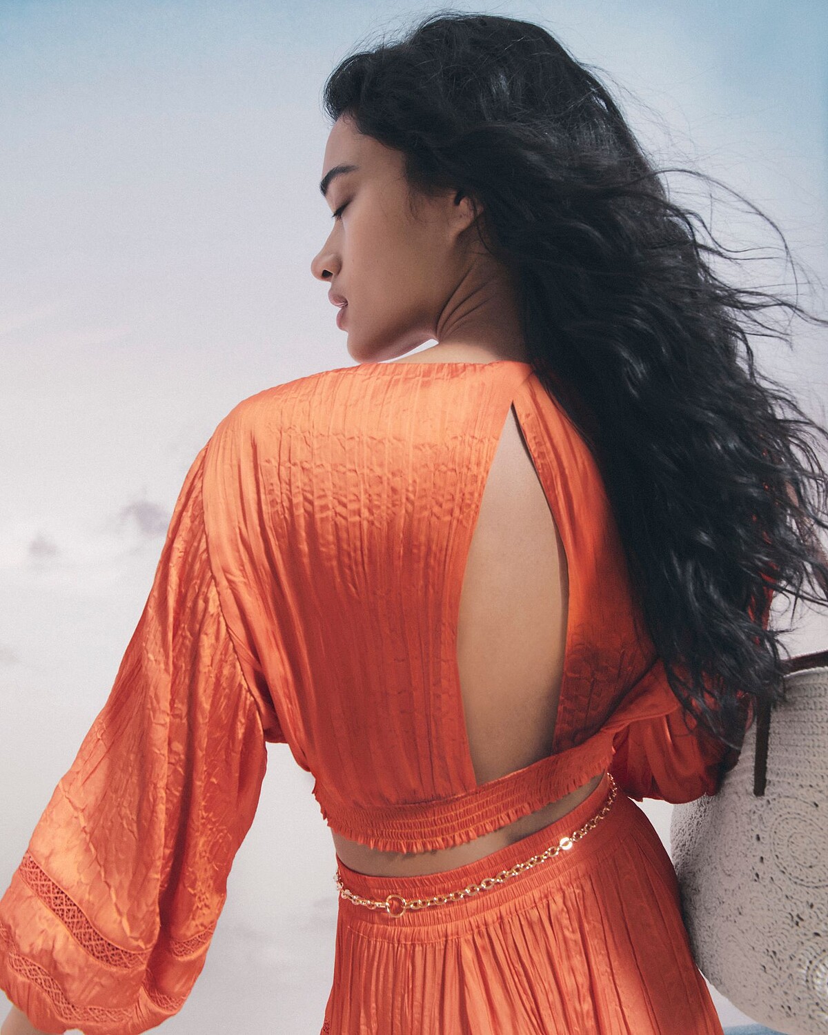 系列色調上運用橙色為主軸,申請不同的橙紅色系,搭配寬鬆輕盈的輪廓剪裁,彷彿暖陽映照在身上般,想像自己走入七○年代的加州海灘,夢幻又深具魅力。