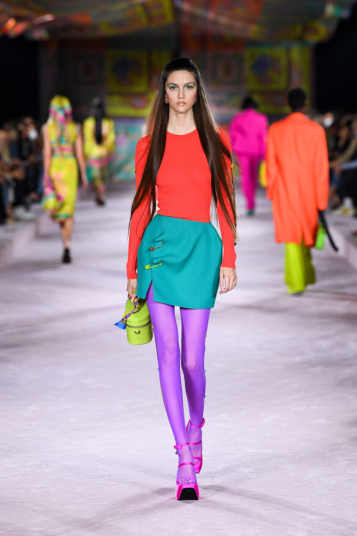 Versace 在 2022 春夏系列上帶來許多撞色風格的穿搭示範,妳可以參考 Model 簡潔的色塊式穿搭,運用撞色技巧,展現明亮的時髦風格。