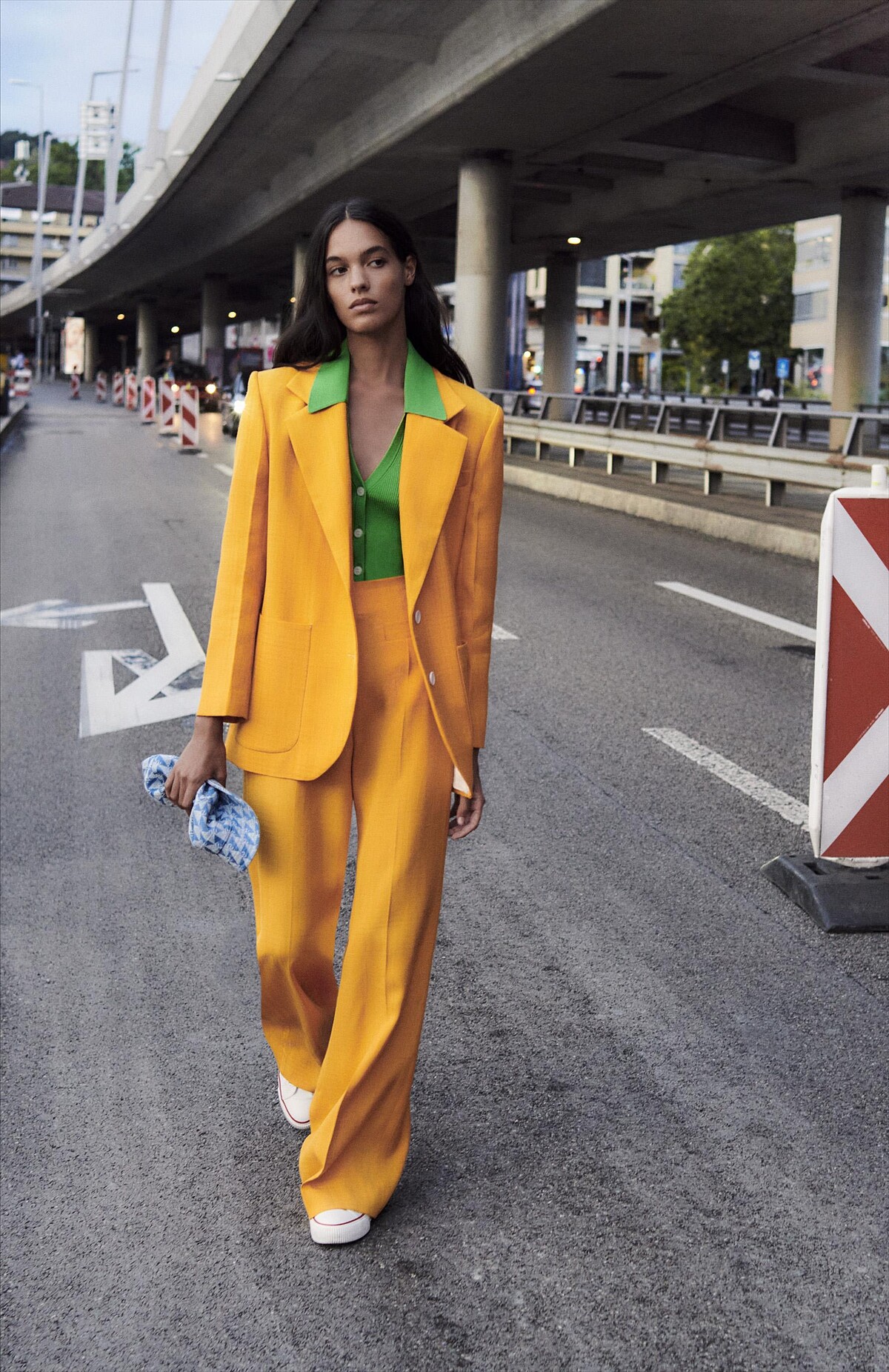 又或是如 Sandro 系列形象的造型示範,運用粉與黃或是黃與綠的視覺衝突,結合正裝風格,打造率性的摩登特質。