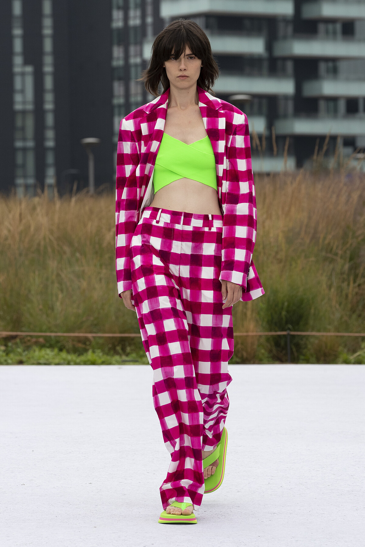 除了色塊式的穿搭方式,也能參考 MSGM 2022 春夏的風格示範,格紋的撞色搭配也能展現時髦態度,桃紅色系與螢光綠營造的視覺衝突,結合中性氣質的西裝套裝,打造屬於女人的帥氣風格。