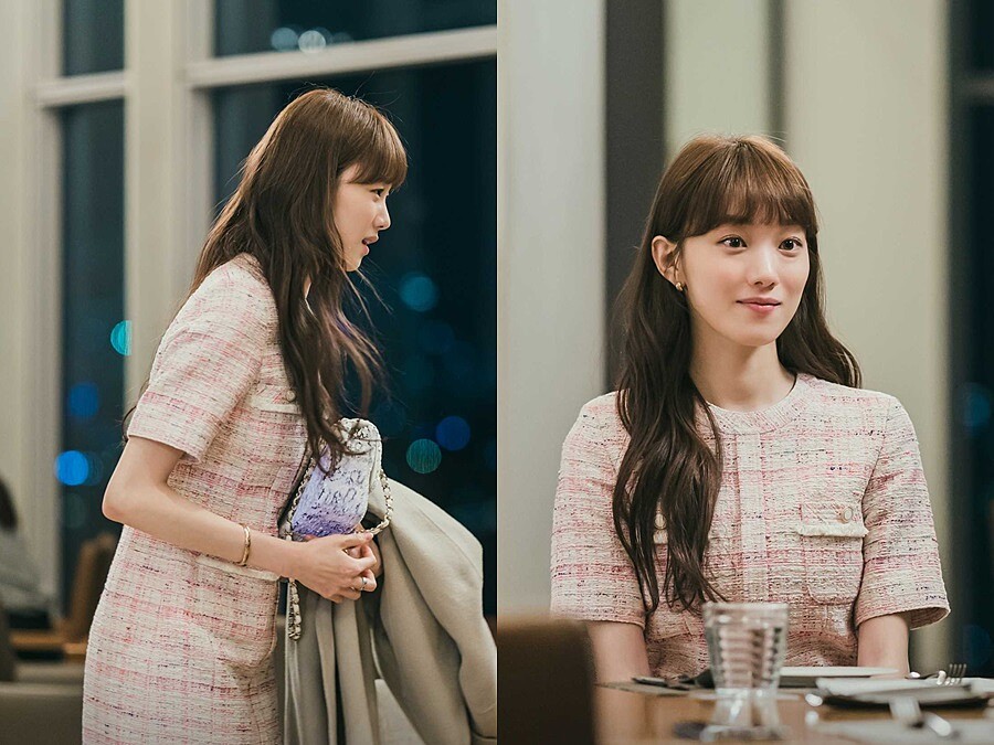 與男主角相戀前,曾參加相親約會的李聖經,選擇小香風毛呢短洋裝出席,短洋裝有個好處,就是能露出雙腳拉長整體比例,特地捲了波浪捲髮,營造出浪漫甜美氣息。