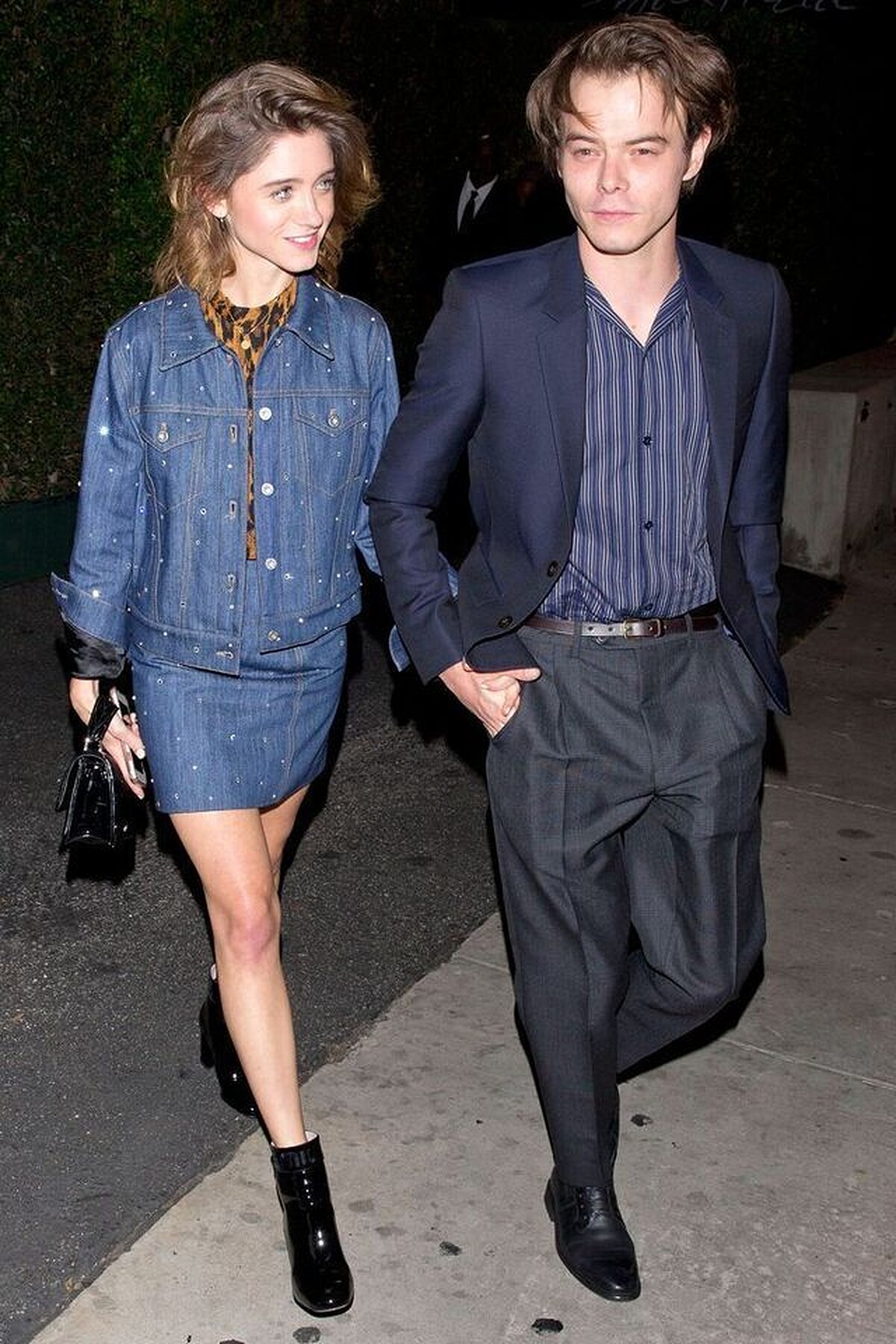第一次穿情侶裝的朋友,不妨學 Charlie Heaton 和 Natalia Dyer 選出兩個重點顏色,彼此上下身單品相呼應看上去就會很和諧。像 Charlie Heaton 就以藍色條紋西裝搭配西外,而女友 Natalia Dyer 則以同色系但不同材質的牛仔套裝做混搭,且兩人下身的鞋款都是黑色系,簡約又統一的風格質感瞬間加乘。