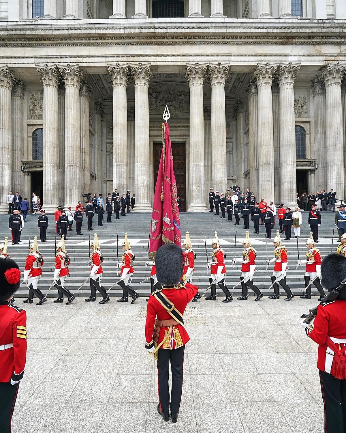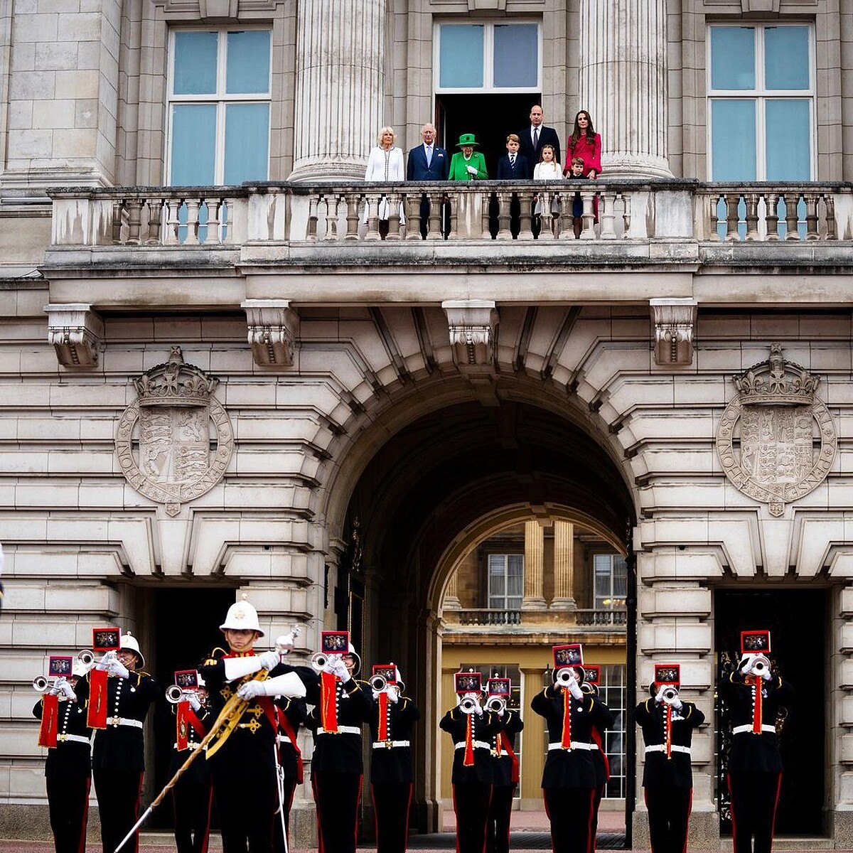 最後一日的儀式,英國女王換上翠綠色套裝,元氣滿滿的與人民打招呼。凱特王妃、威廉王子帶著小王子和小公主登場,凱特王妃身上的薔薇紅洋裝十分吸睛。