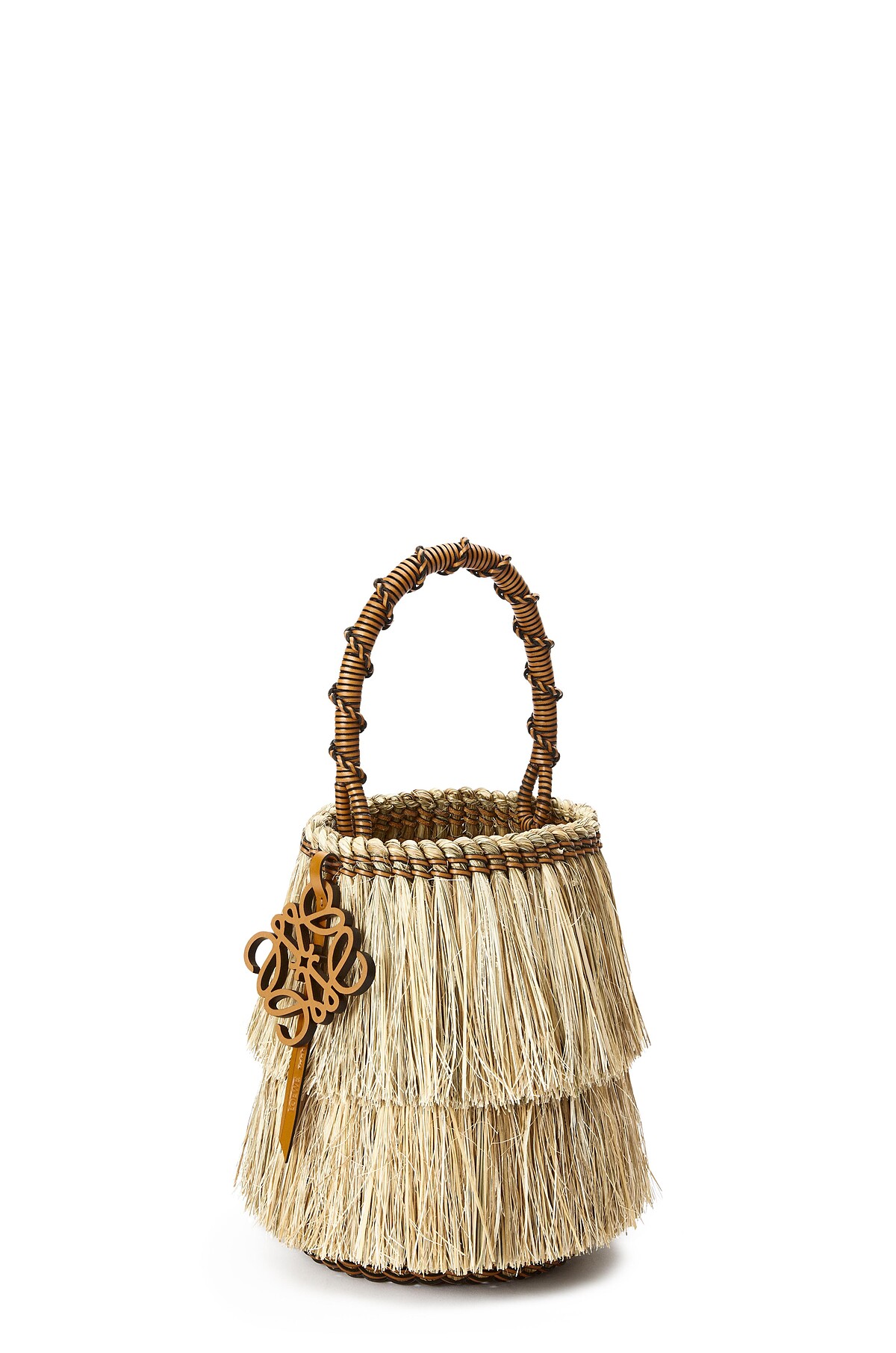 以農村生活的簑衣為靈感,包身採用蘆葦編出流蘇外層,交織小牛皮繩索於其中而成;提把的部分,同樣為小牛皮盤繞編織,內袋則為帆布材質,並以Anagram掛飾點綴。