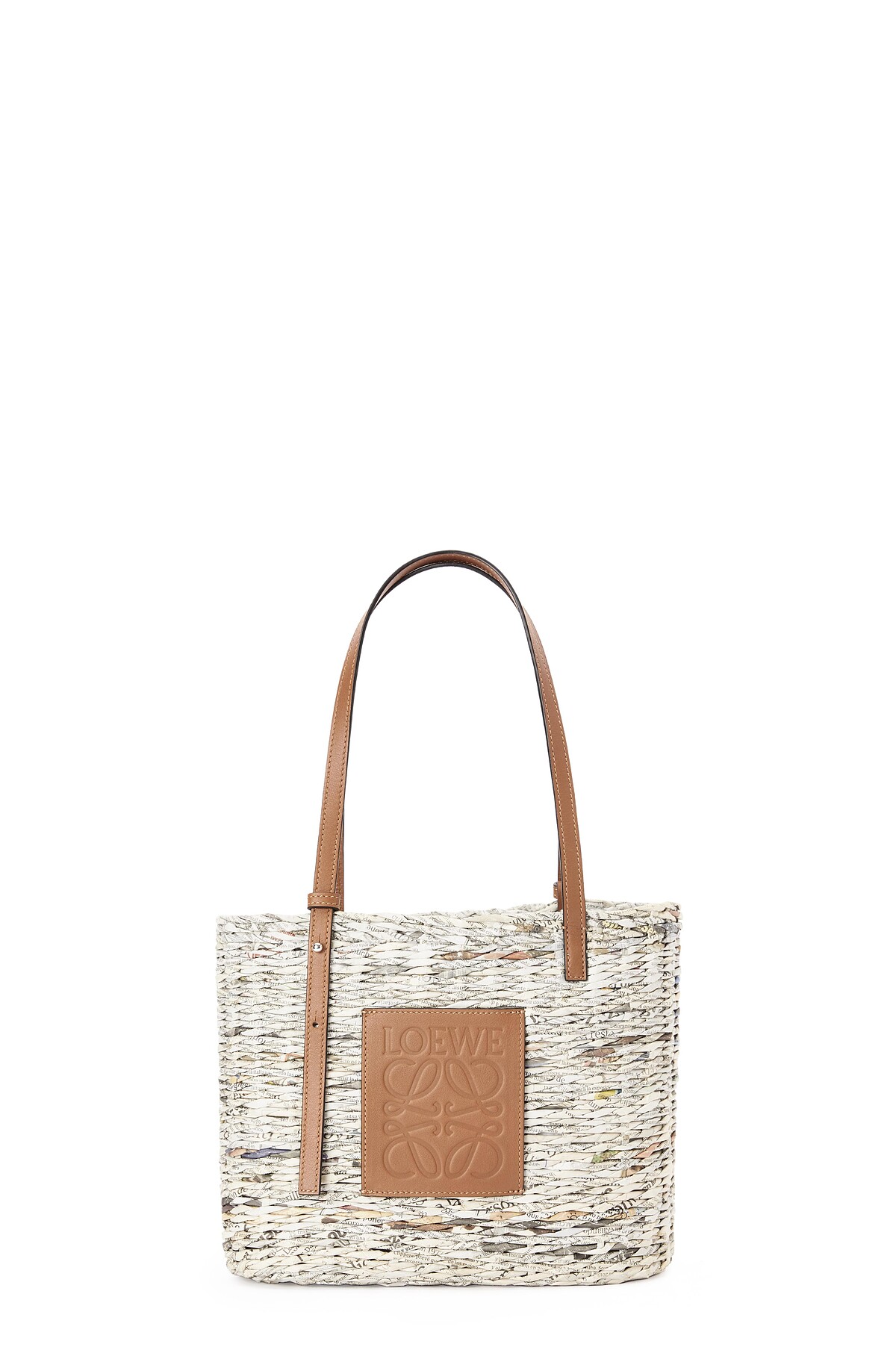 保留報紙的油墨印刷文字與顏色,淡雅的灰白色調顯得相當質樸,搭配小牛皮的背帶,並在包身縫上有著立體壓紋的Loewe Anagram小牛皮作為裝飾。