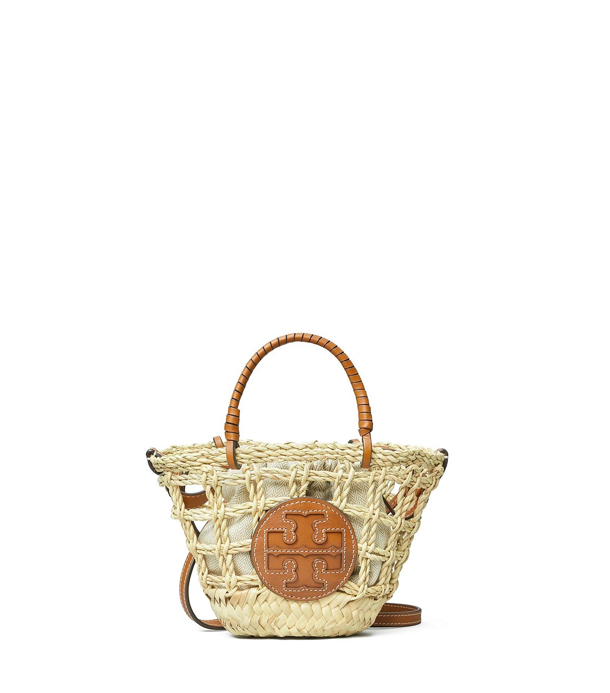 摩洛哥藤草編織Ella提籃,鏤空的編織設計別具夏日氣息,並以小牛皮的材質打造logo裝飾和提把背帶。