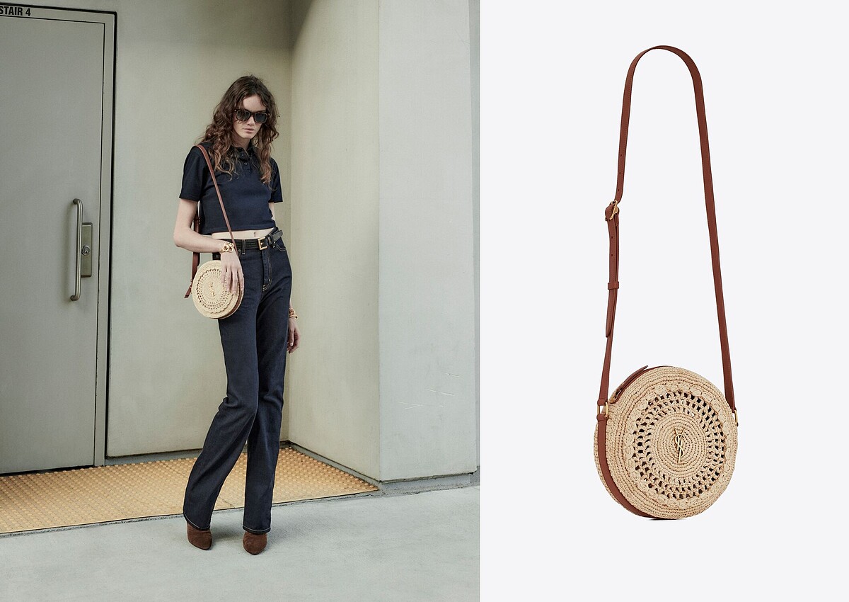 外型可口如餅乾的圓形小包,用拉菲亞草編織出一圈圈的小花圖樣,低調點綴上YSL logo金飾並搭配焦糖色牛皮可調式背帶。