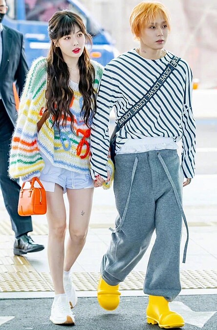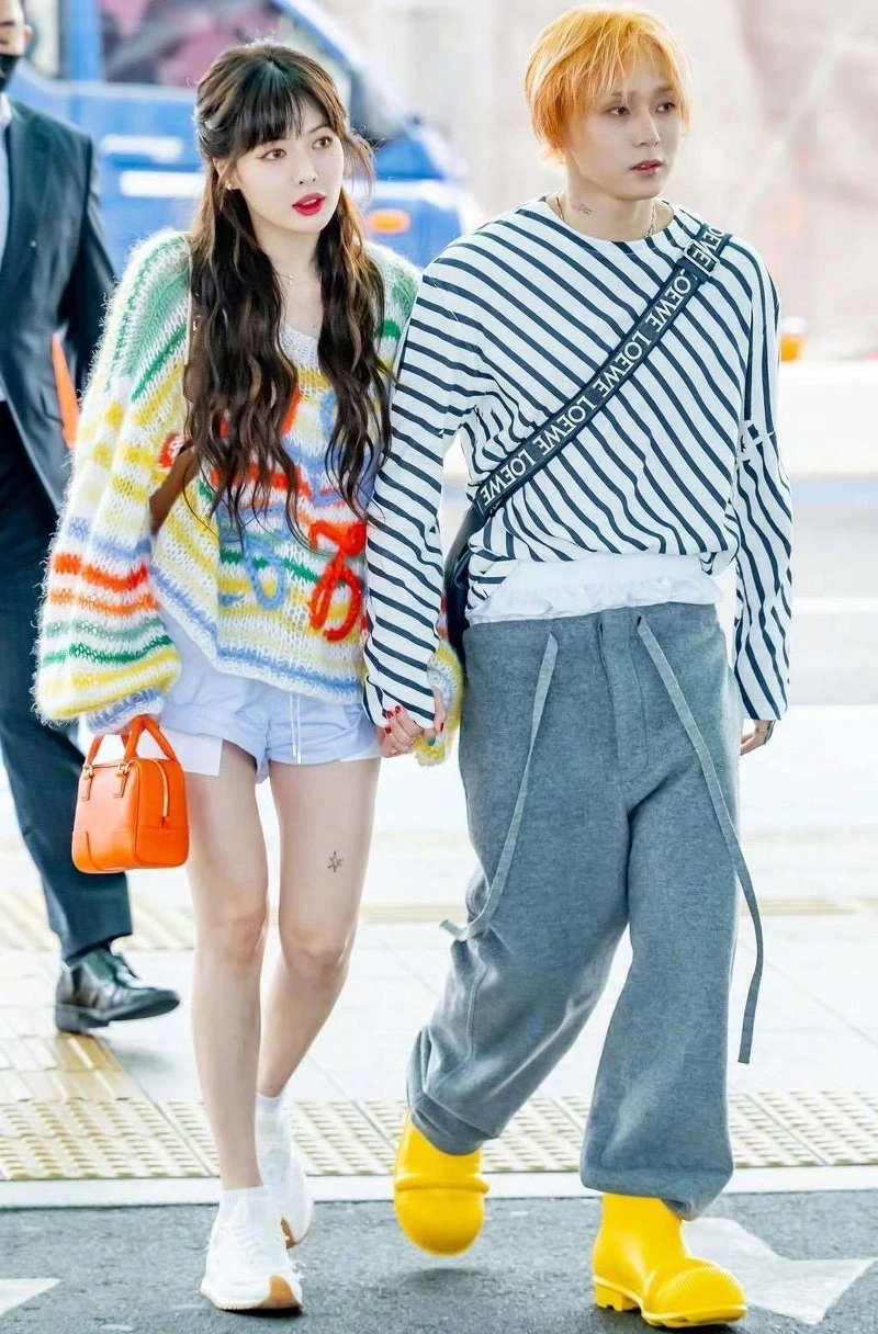 乍看之下以為兩人沒有特別穿上情侶裝,但其實不然,泫雅的針織毛衣上的圖騰為彩色線條,下半身的短褲也有條紋設計,恰巧和Dawn的黑白條紋上衣相呼應。情侶們下回想要低調放閃,不妨參考雙金夫婦這招。