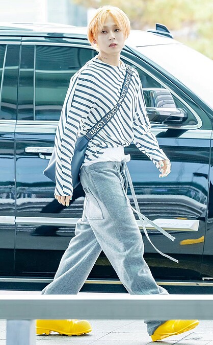 金曉鐘換上黑白條紋上衣,搭配灰色休閒褲,露出一大截的白色腰頭,相當符合Dawn平時的穿衣風格,腳上這雙亮黃色橡膠靴,為Loewe的人氣靴款,最後背上Loewe大托特包,展現率性又帥氣的一面。