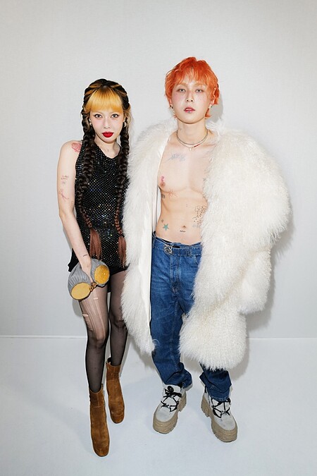 在巴黎登場的Loewe 2023春夏男裝大秀,終於見到雙金夫婦,品牌大使泫雅一身黑色迷你短洋裝,搭配破洞造型褲襪,手上拎著Loewe新登場的手拿包,性感指數破表;身旁的未婚夫Dawn上半身打赤膊罩上一件浮誇系白色毛大衣,搭配Loewe丹寧牛仔褲,露出壯碩的胸肌、六塊肌,這畫面讓粉絲相當苦惱,到底要把目光放在誰身上。