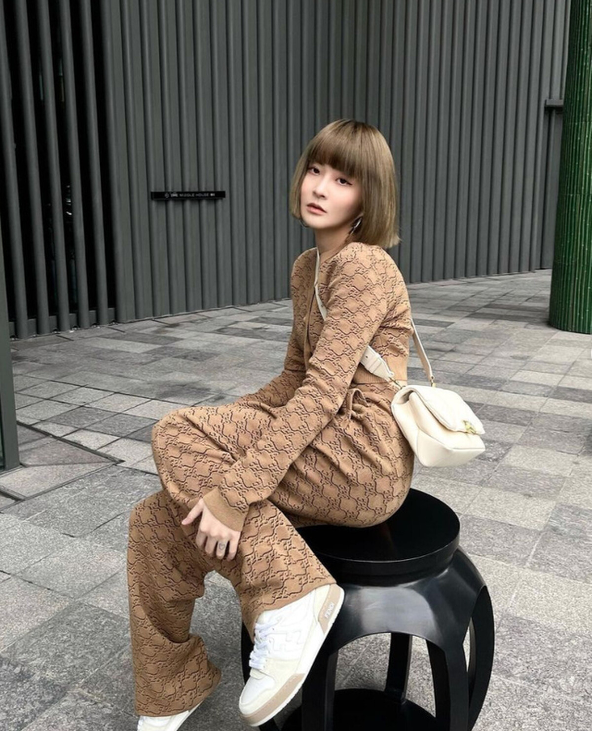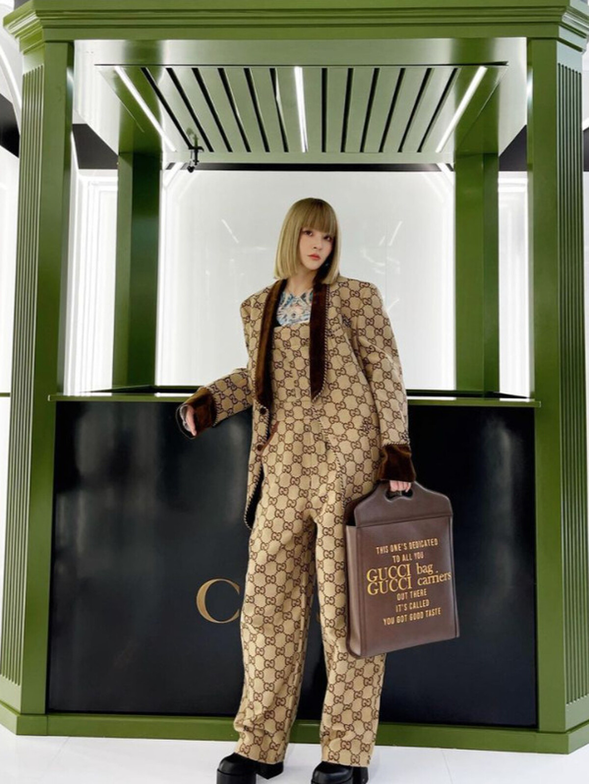 多數女孩畏懼的滿版印花款式服裝對小白來說卻是造型加分利器!像是小白選擇的這件 Gucci Logo 圖騰西裝外套本身已經相當花俏,為了不讓視覺感變得雜亂,她也特別搭配同色系的吊帶褲,並上腳黑色後底皮鞋,會看起來更為協調。建議穿著鮮豔色彩的服飾時,不管你所搭配的是褲子還是上衣,都必須是以簡單顏色為主,例如:黑、白、灰色,才能平衡整體視覺。
