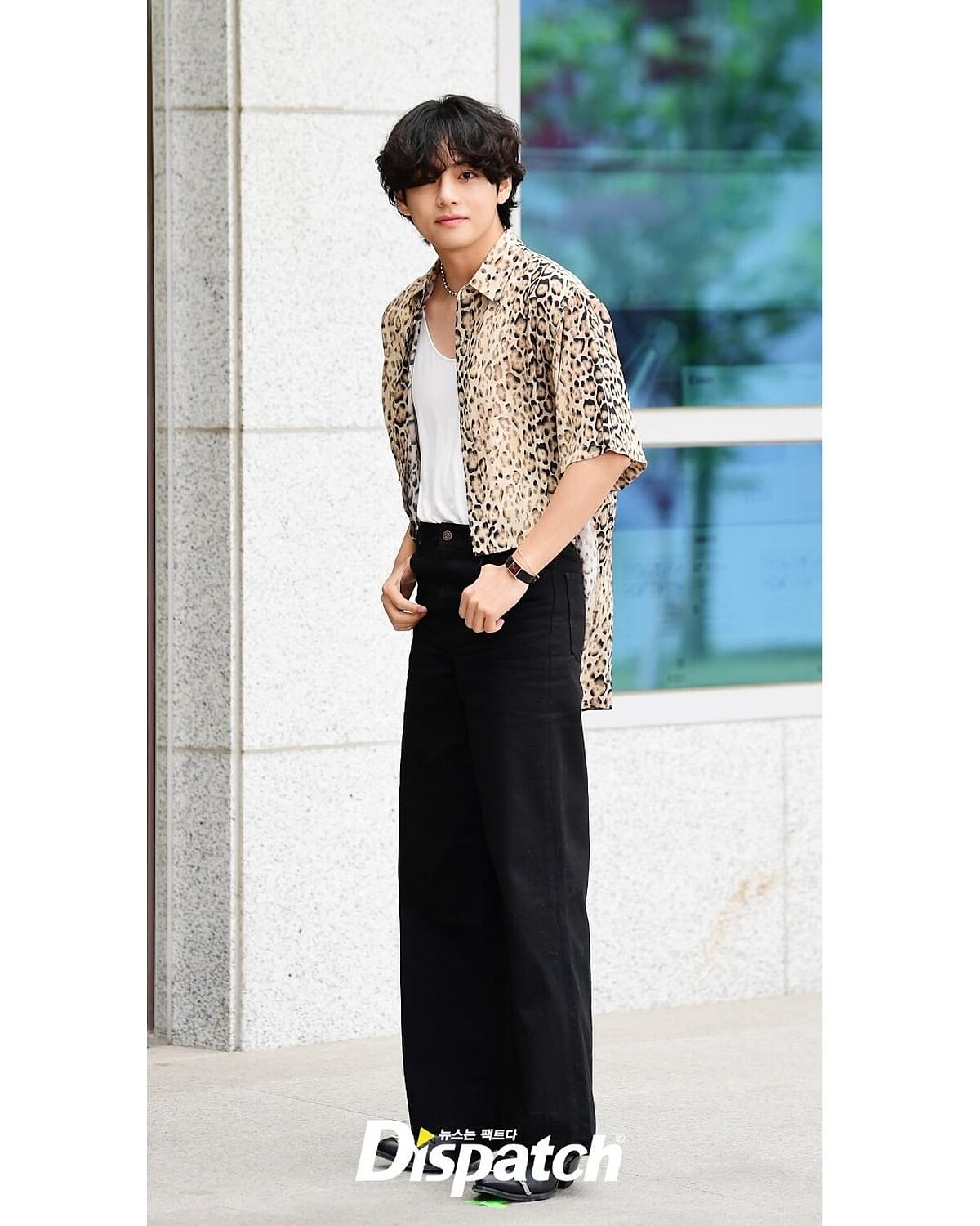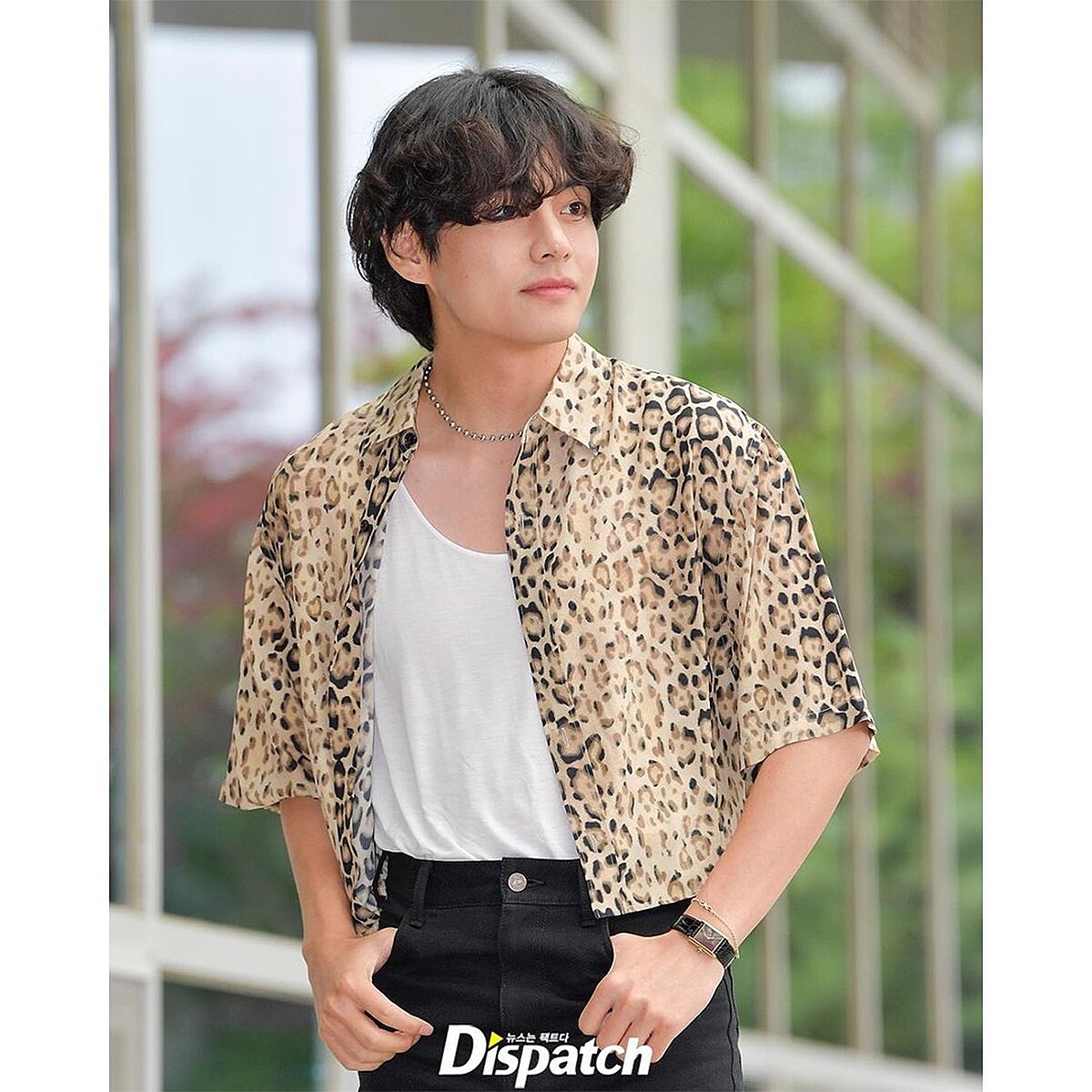 簡單的白上衣+黑褲組合,金泰亨的透膚豹紋上衣成為最大亮點,前短後長的不對稱設計展現細節品味。另一大看頭還有金泰亨手腕上的卡地亞vintage錶款(The Le Must De Cartier Tank),現已停止生產,想要收藏的錶弟妹們僅能在中古錶市場碰碰運氣。
