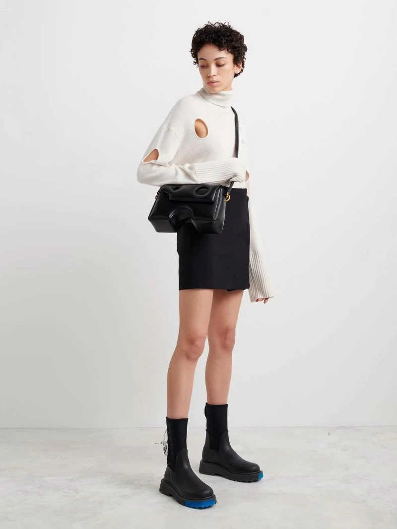 洞洞乳酪外型的Burrow Bag看似前衛,拆解包包的輪廓之後會發現,就是圓形與幾何的線型組合,俐落的線條頗具個性,既有辨識度又相當百搭。