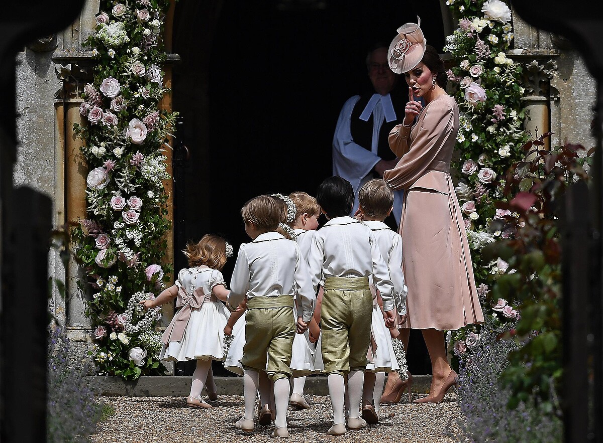 爾後經常看到凱特王妃採用同樣的親子穿搭巧思,像是在妹妹Pippa Middleton的婚禮上,小花童的夏綠蒂公主,身穿白色小禮服、腰間繫著煙燻玫瑰緞面腰帶,媽媽從女兒身上挑出重點色與其呼應。