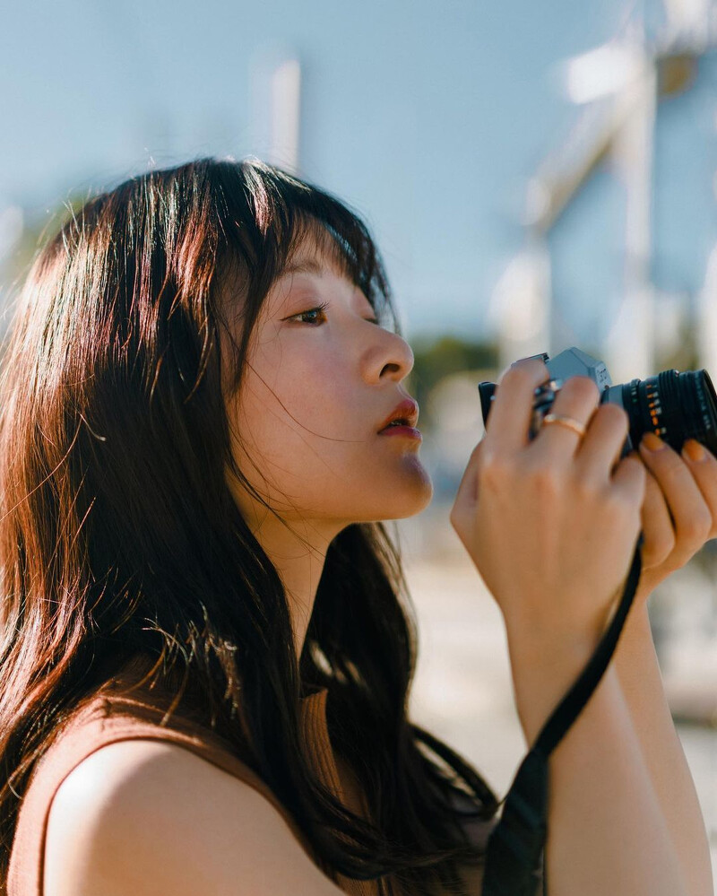 愛拍照的她,時常出外踩點,曾穿過暖橘色無袖背心,搭配格紋百褶裙的組合,展現氣質小姊姊的一面。