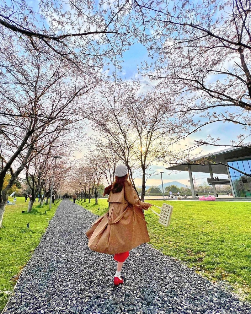 私下出遊時,徐嬌選擇刺繡針織上衣和紅色長裙,再搭配卡其色風衣外套,腳上的紅色娃娃鞋更與裙子相互呼應,打造出甜美可人的造型。