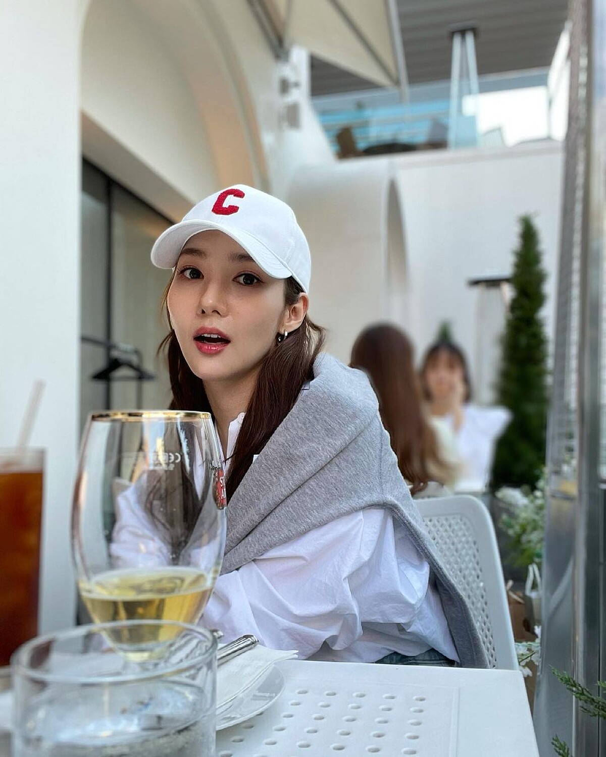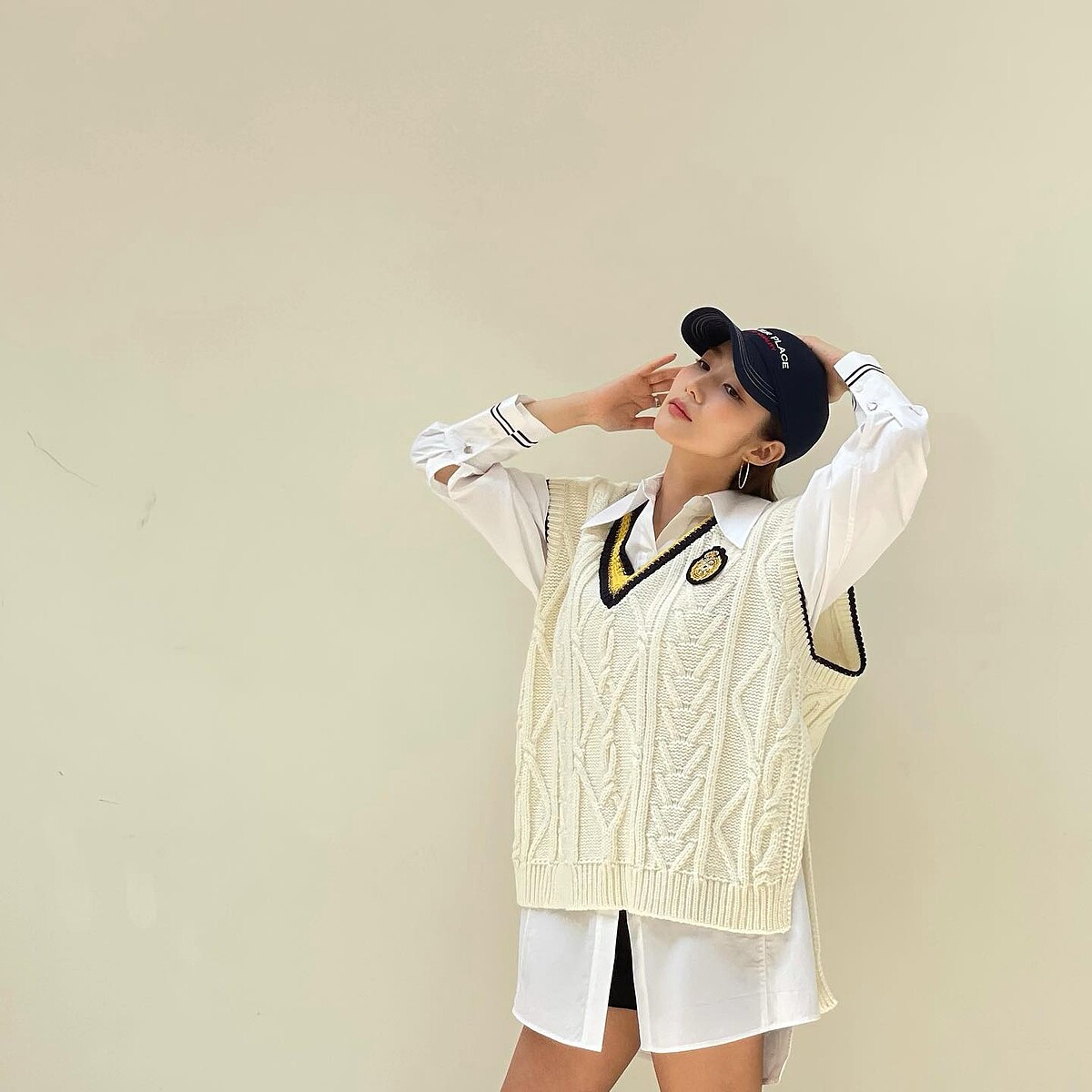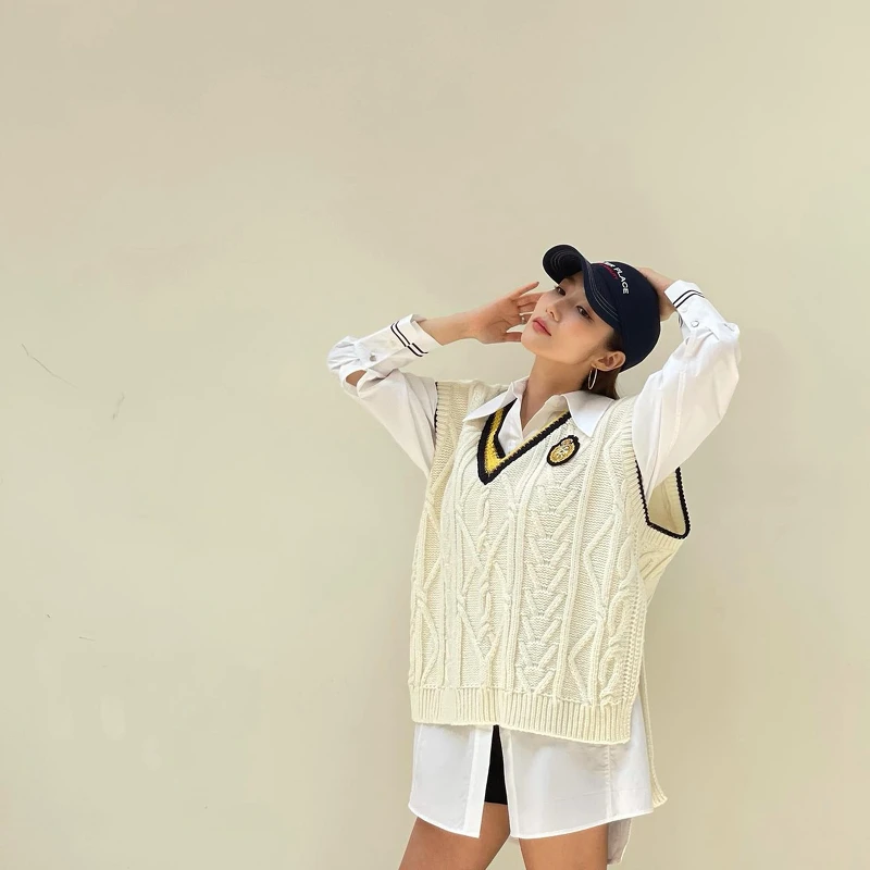 現在高溫出門懶得整理頭髮,隨手抓一頂棒球帽就可以遮住夏日油頭困擾。棒球帽的休閒運動氣質與襯衫組合,朴敏英再疊加上針織毛衣、大學T,穿出減齡的學生氣質。