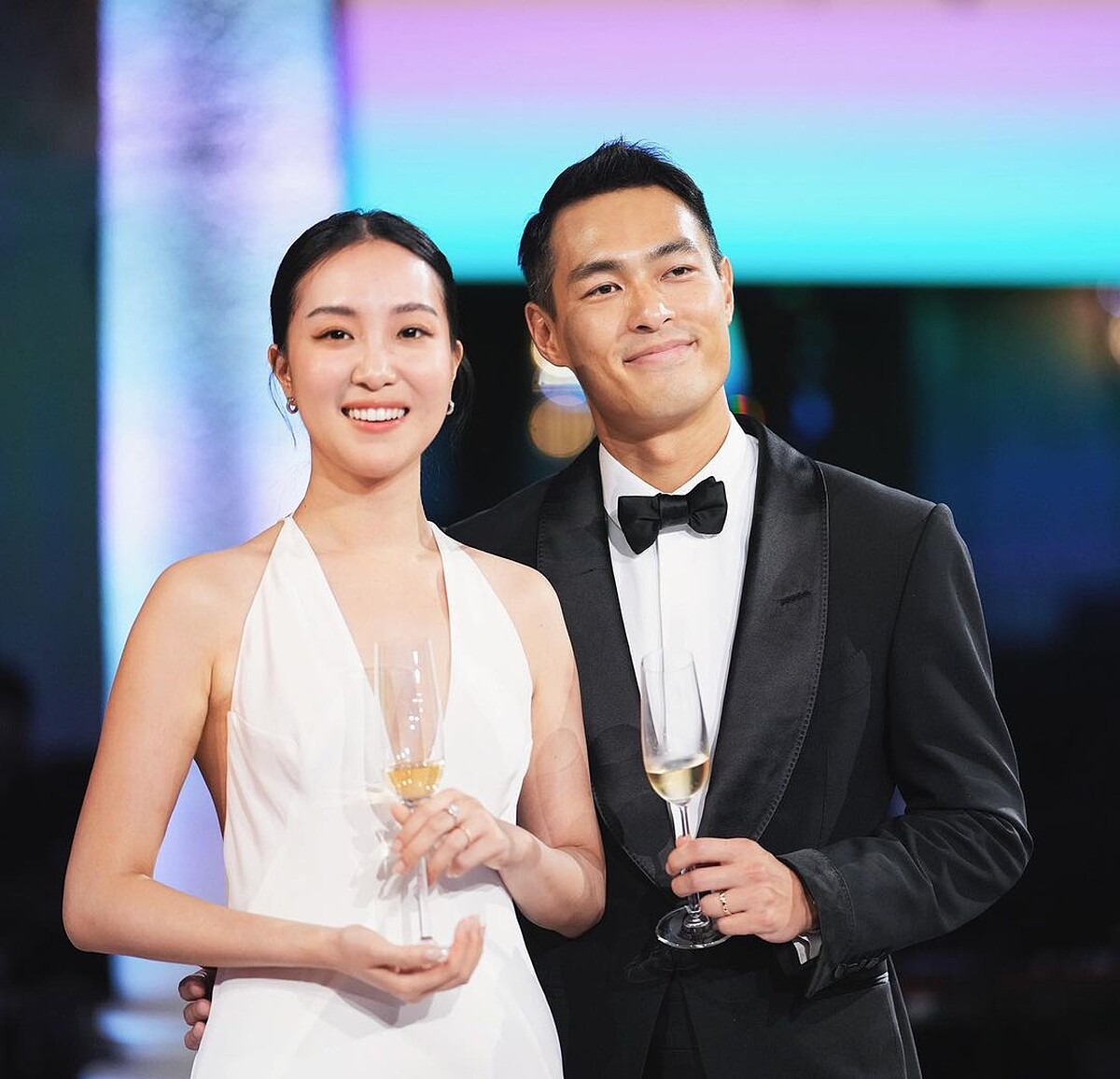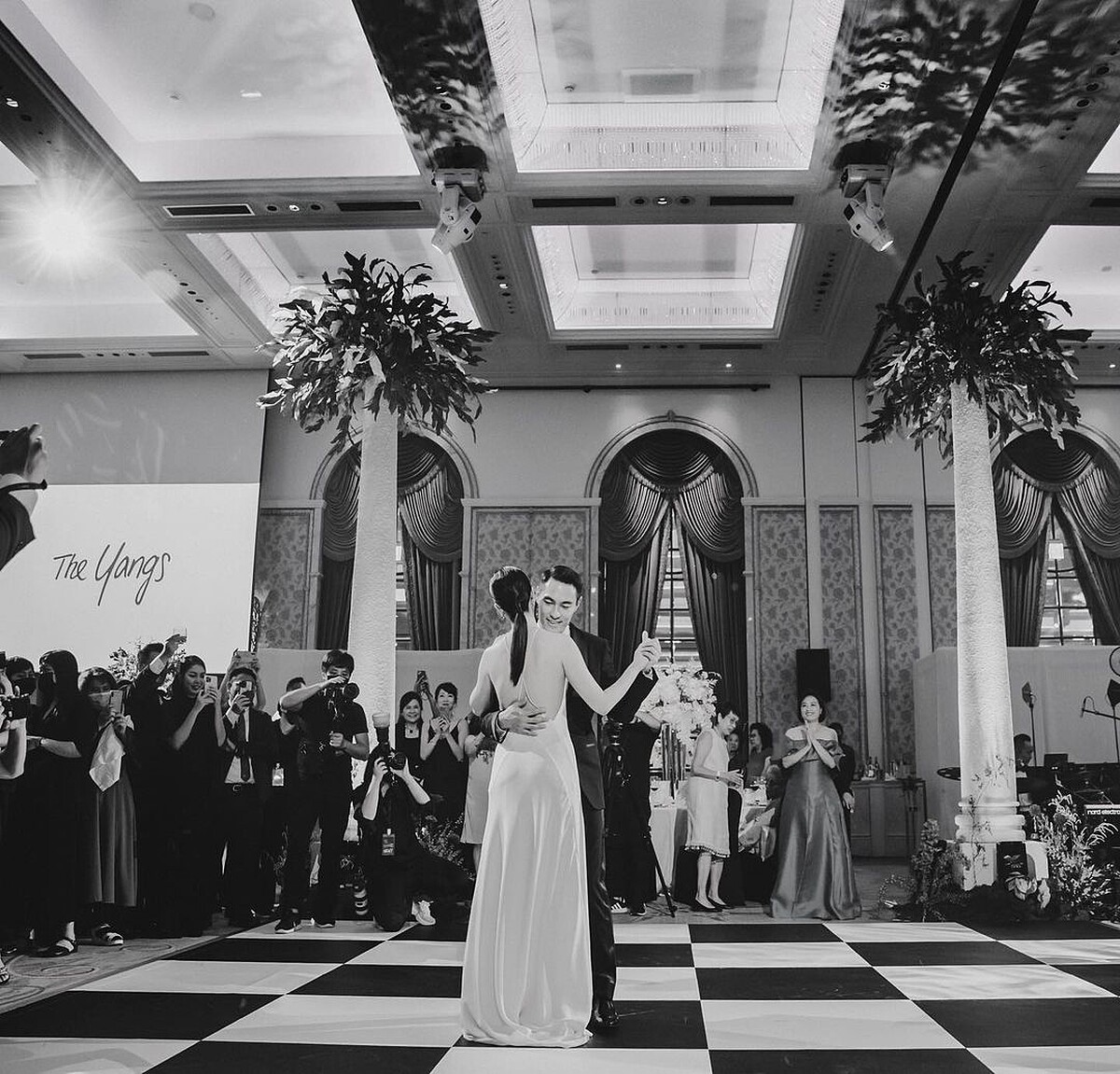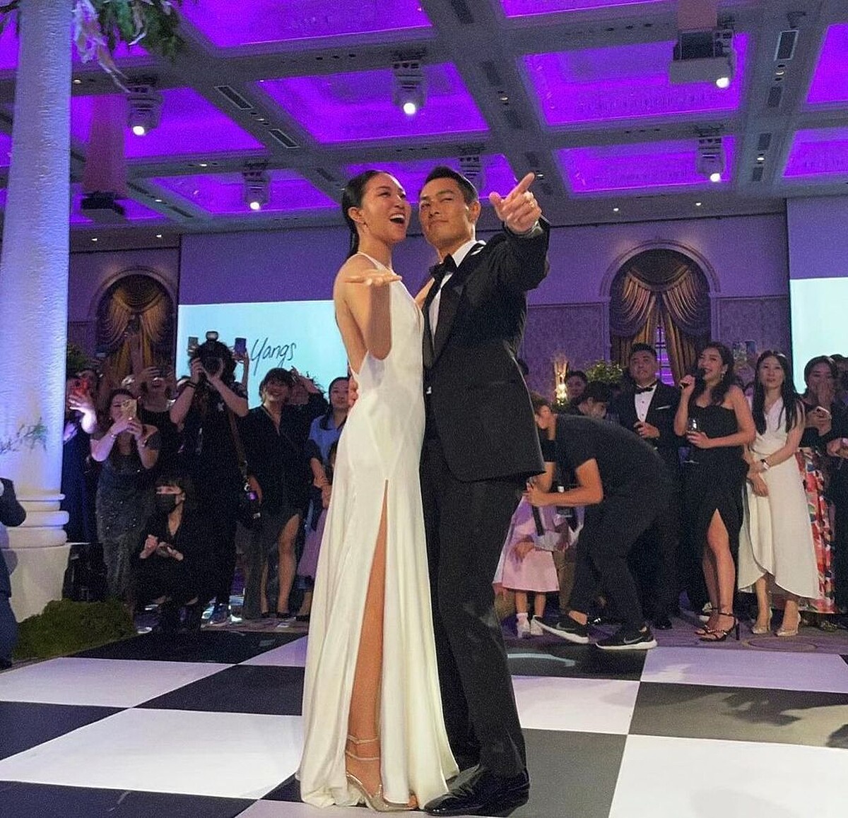 婚禮隔日,楊祐寧老婆Melinda再釋出After Party照片,她與老公楊祐寧浪漫共舞時,從原本MarcoMChan的優雅蕾絲白紗,換上由NET-A-PORTER提供的Michael Lo Sordo白色挖背長禮服,深V、露背外加開高衩設計,展現性感、迷人的樣貌。