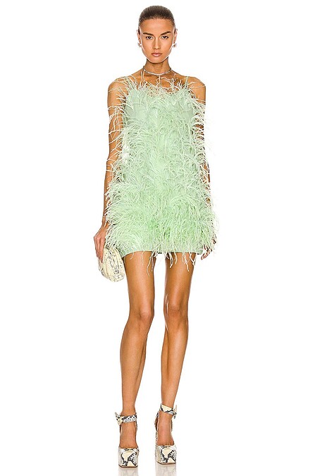 特別以Cult Gaia果綠色羽毛裙搭配Area鑽石腰封,露出白皙長腿拉長身型,最吸睛莫過於頭上的鹿角鑽石頭飾,讓整體造型增添一抹華麗感。