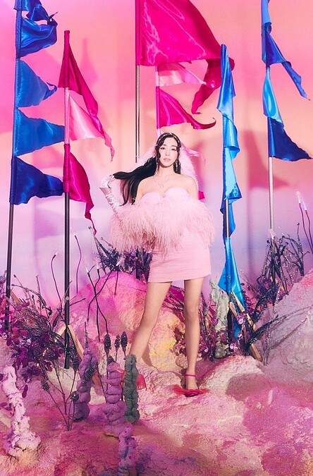 性感指數破表的網狀長裙,是來自北歐人氣品牌Ganni,太妍在裡面搭配黑色Bra Top和迷你短褲,營造出性感又魅惑的迷人氣息。