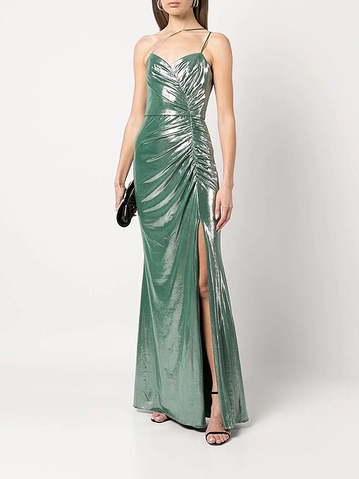 忙內徐玄以Marchesa Notte湖水綠長洋裝登場,又是細肩帶又是開高衩設計,將徐玄高挑身材、修長大腿展露無疑,更顯她肌膚的白皙動人。