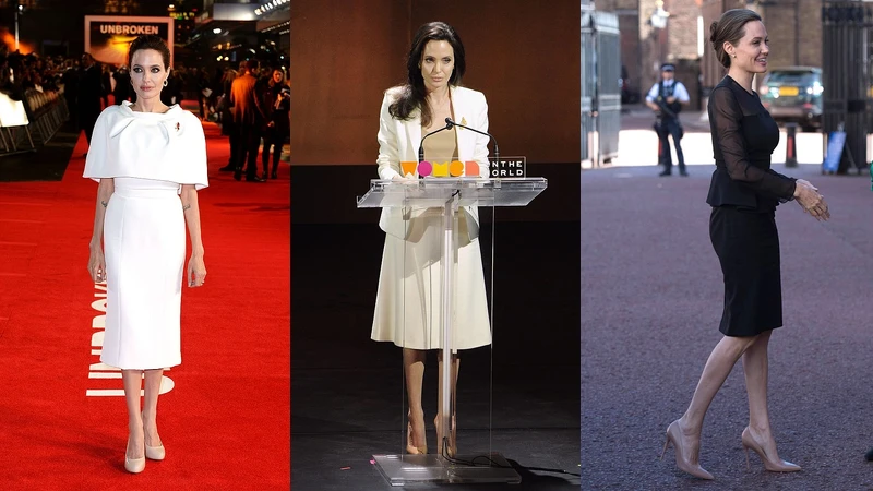 裘莉經常選擇裸色鞋履,無論是搭配洋裝或套裝的米色高跟鞋,或是度假時穿的舒適米色綁帶涼鞋,在視覺上拉長腿部比例。 為了能達到「大長腿」的視覺效果,在裸色鞋履選購上,需要盡量以貼近自己膚色的鞋履為主。