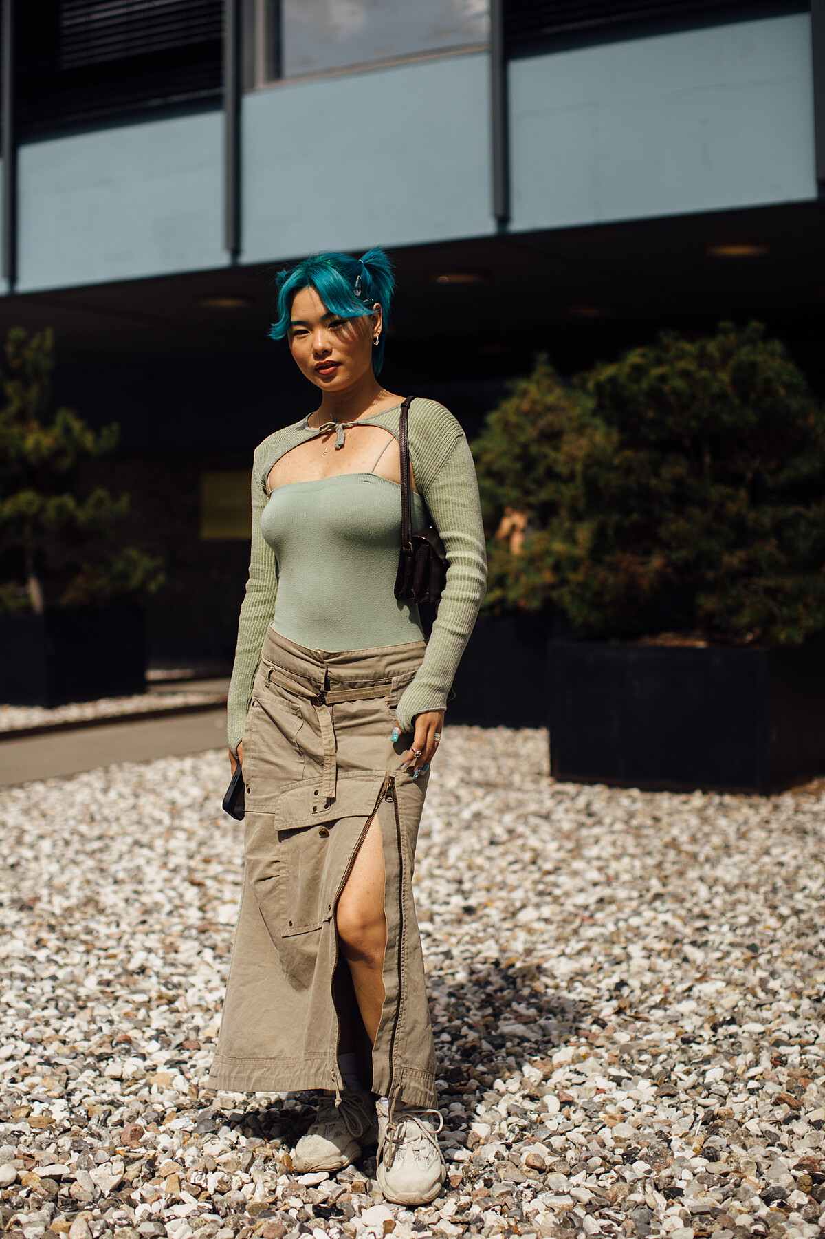 大地色系的造型與白鞋搭配也能展現視覺和諧的效果。