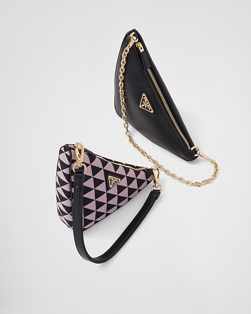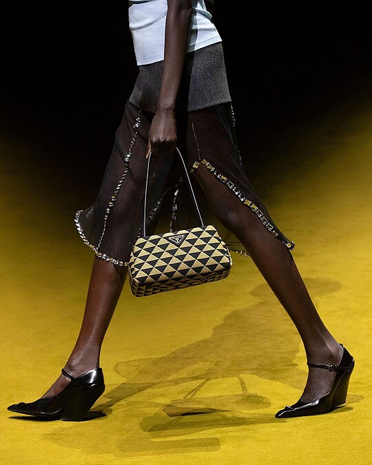 Prada經典三角形在Symbole包上有了嶄新面貌,以大膽前衛的幾何設計重新演繹,將三角形排列組合成全新圖案,並與包款呈現出對比色彩,成為所有目光的焦點。