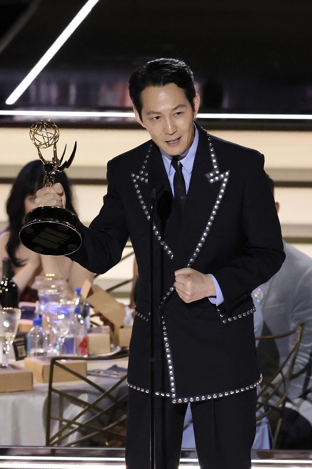 第74屆艾美獎的星光紅毯,超甜蜜攜手13年女友林世玲出席,李政宰以Gucci訂製西裝亮相,外套領片、下襬甚至是口袋邊角,皆綴以閃耀光澤的銀色飾釦,無疑為李政宰增添與眾不同的迷人魅力。