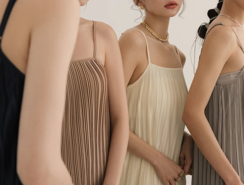 「平領細褶細肩帶洋裝」簡約卻不簡單,處處都是絕美細節!露出鎖骨線條打造純欲氣質,任何場合都能輕鬆駕馭