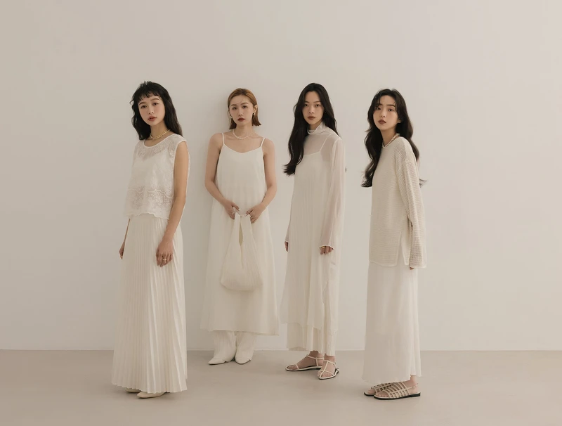 LOOK1:平領細褶細肩帶洋裝 +「微透肌感圓領造型上衣」在夏秋過度期也能讓肌膚自由呼吸