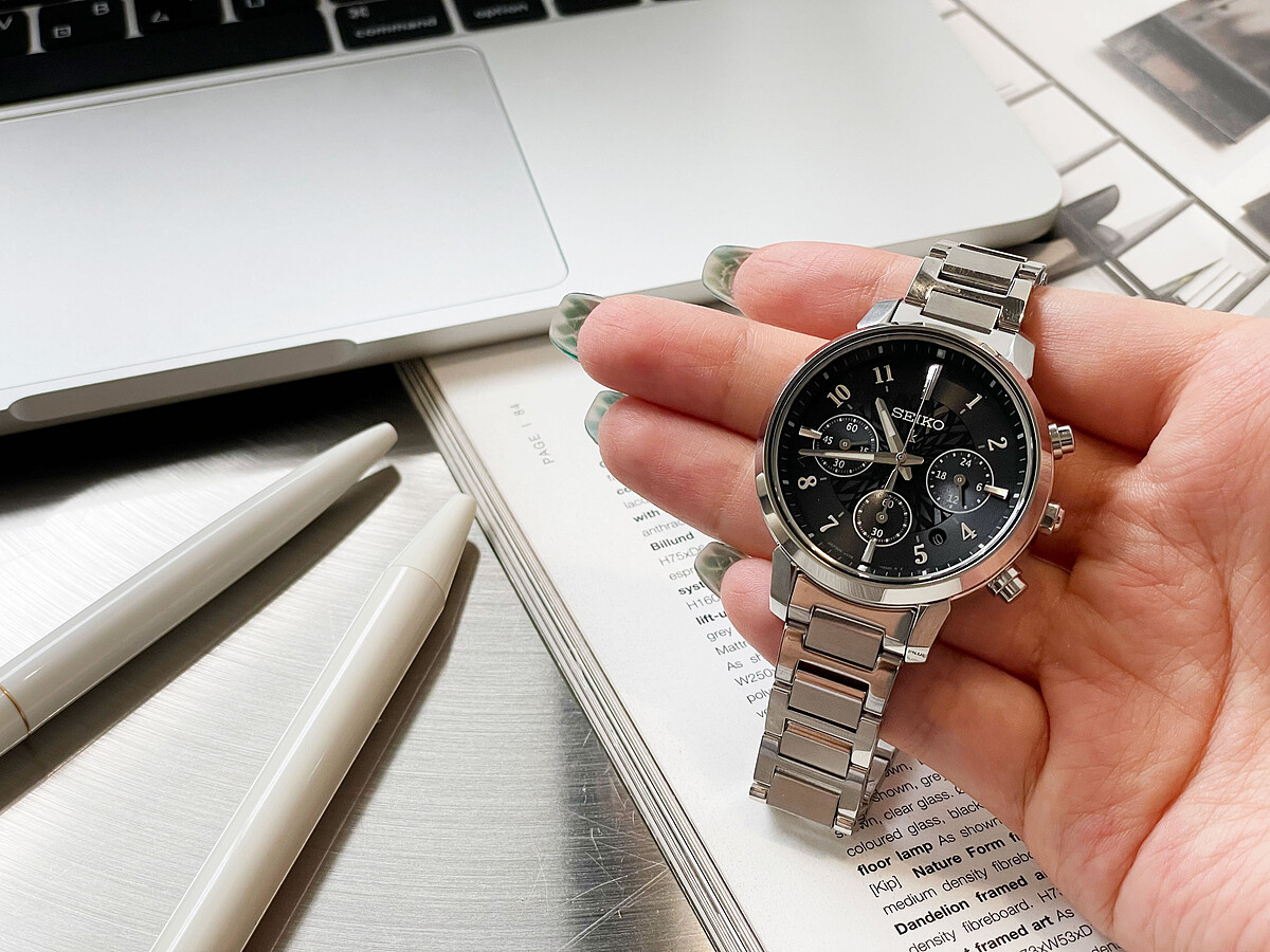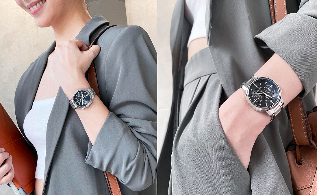 內斂的黑色錶面搭上高對比銀色錶圈,與沈穩不銹鋼錶帶,帥氣感十足的大錶面腕錶SSC905J1是M編預測最符合下半年時尚風格的必備單品。試戴黑色錶盤款,M編認為Seiko Lukia恰如其分的提升了沈悶的職場穿搭。俐落摩登的顏色線條,不管是搭配西裝外套、襯衫都增添了更多個性。會議時、辦公書寫時,抬起手腕露出簡約大錶面與醒目的黑色三眼計時,恰如其分地展現女孩俐落積極的個性態度。寬鬆的大地色針織衫搭上一條白色寬褲,黑色錶盤款也十分適合下班後的率性穿搭,洗鍊的穿衣風格加上Seiko Lukia後更添隨性帥氣!