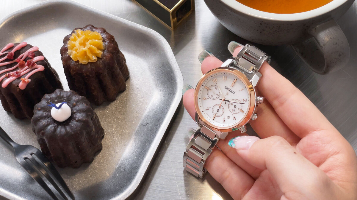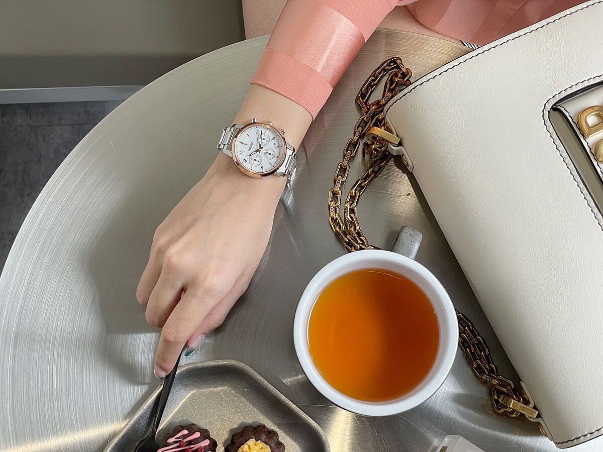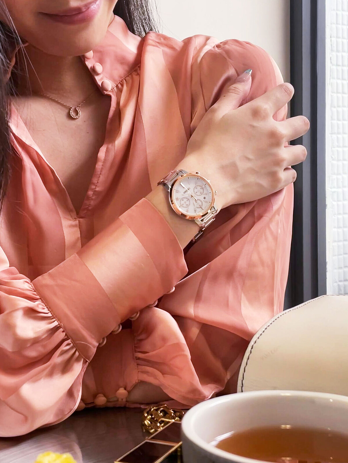 簡約的白錶面搭配甜美的玫瑰金錶圈與錶面數字,白錶面款SSC906J1自帶從容氣場。抬起手腕,三眼計時功能陪你細細品味沉靜下來每分每秒的時光。M編試戴白色錶盤款,玫瑰金色系搭上不銹鋼錶帶,可甜可鹽的設計自由切換甜美帥氣與溫柔優雅的不同風格。粉金色的絲質襯衫與玫瑰金錶面相呼應,讓幹練的工作日添上一絲溫柔,展現女性力量。週末假期,無論是前往藝文展的知性褲裝,或是與姊妹相約下午茶的甜美雪紡洋裝,Seiko Lukia 優雅內斂的造型設計是最合適的時尚配件!