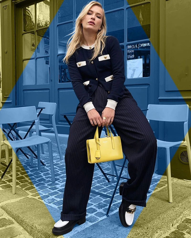 正宗的法式女孩穿搭代表——Camille,知性的針織開襟衫搭配率性又帥去的條紋寬褲,一襲沈穩的深藍色褲裝造型用一顆檸檬黃的Prada手提包作為亮點,時髦卻不過於浮誇,不失為你我日常的穿搭典範。