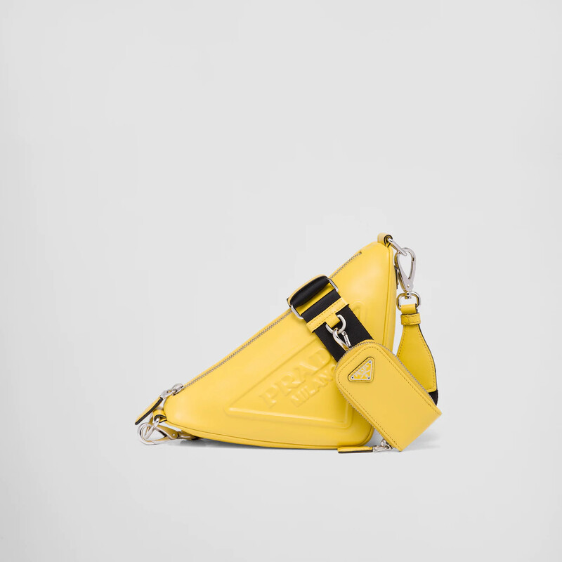 從Prada logo延伸而來的三角包,強化了品牌的俐落與簡約個性,用色向來大膽的Emily入手了豔陽黃的款式來搭配。