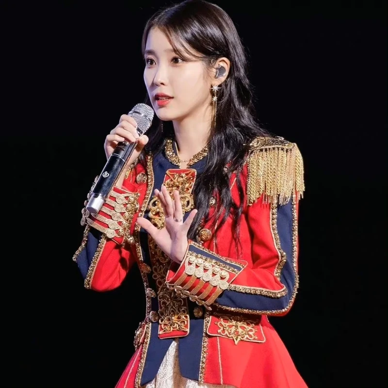 以紅、藍、金色打造的軍裝外套,裡頭的白色蕾絲洋裝,配上黑色綁帶長靴,讓IU化身帥氣的女騎士,展現出不同於日常的一面。