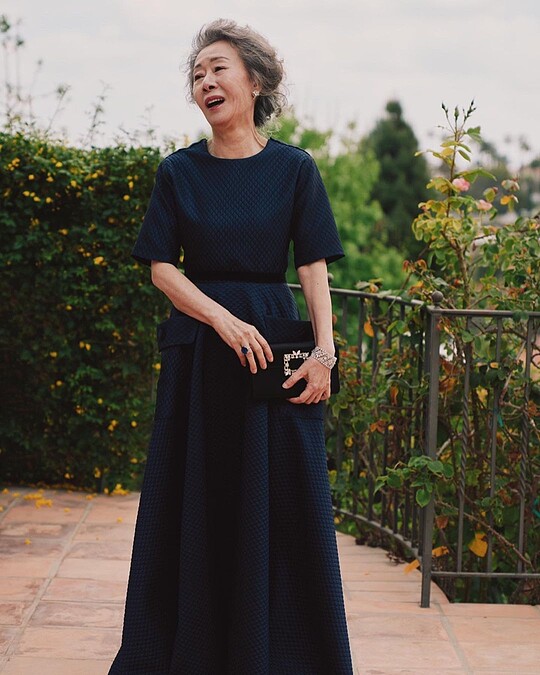 第93屆奧斯卡女配角得主尹汝貞,選擇杜拜設計師品牌Marmar Halim的深藍色短袖格紋禮服出席頒獎典禮。