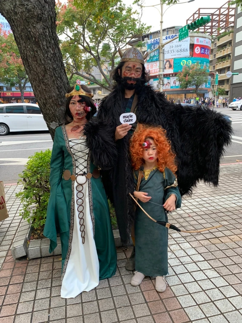 以《勇敢傳說》為主題的一家人,完整呈現卡通裡蘇格蘭高地族群的穿著,爸爸如同維京人的打扮,媽媽是有點不同以往的皇后,相信小女孩也會如故事中的梅莉達一樣無所畏懼。