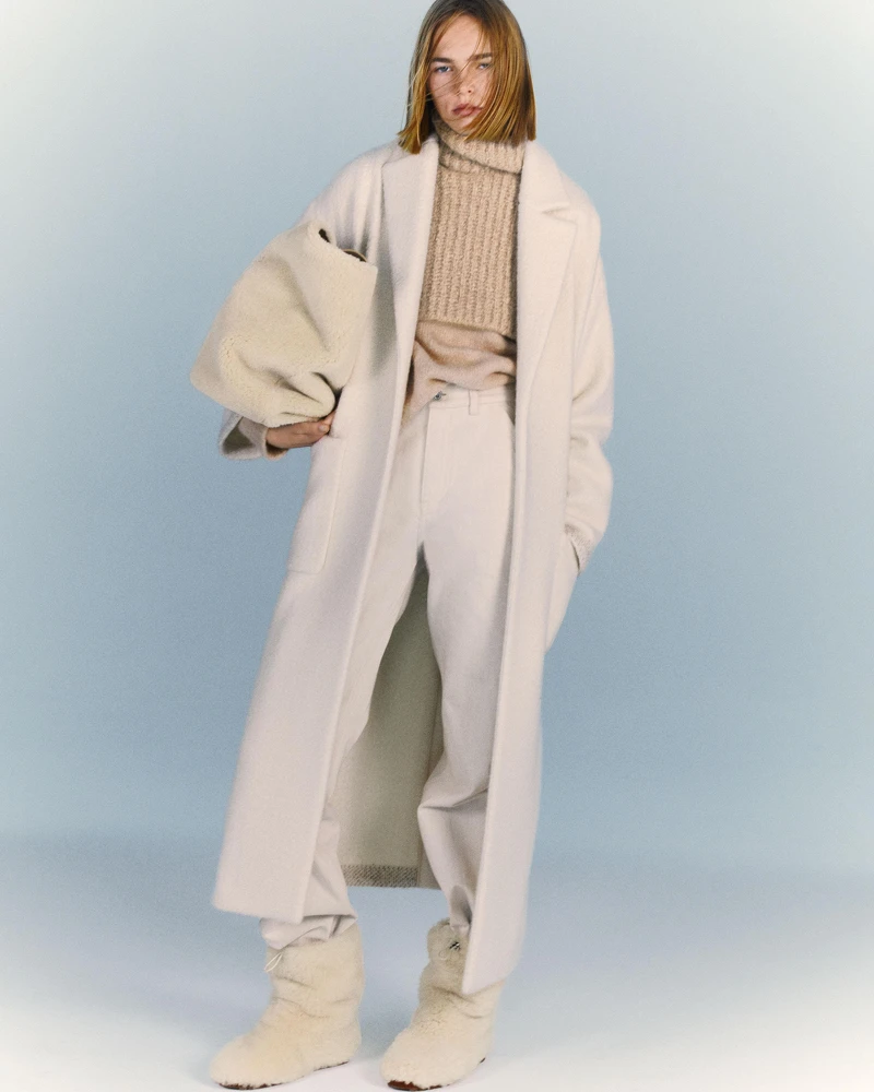 大衣是許多人在冬天會選擇搭配針織衫的單品,本季不妨選擇超長版的大衣搭配短版針織衫,營造視覺上的長短層次,同時增加身材的好比例。