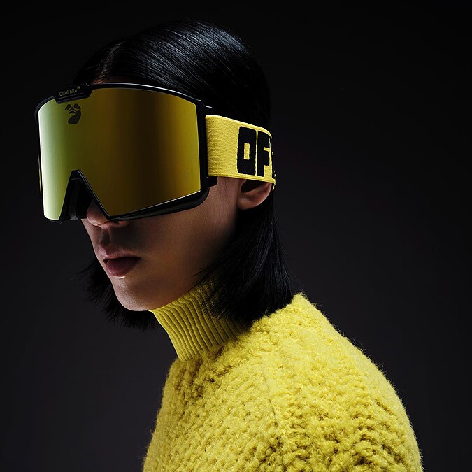 除了前衛多彩的建築美學,你也可以看到 Off-White 經典的工業風腰帶元素結合了滑雪護目鏡,帥氣有型的鏡框設計搭配工業風織帶,更多了分未來科技感。