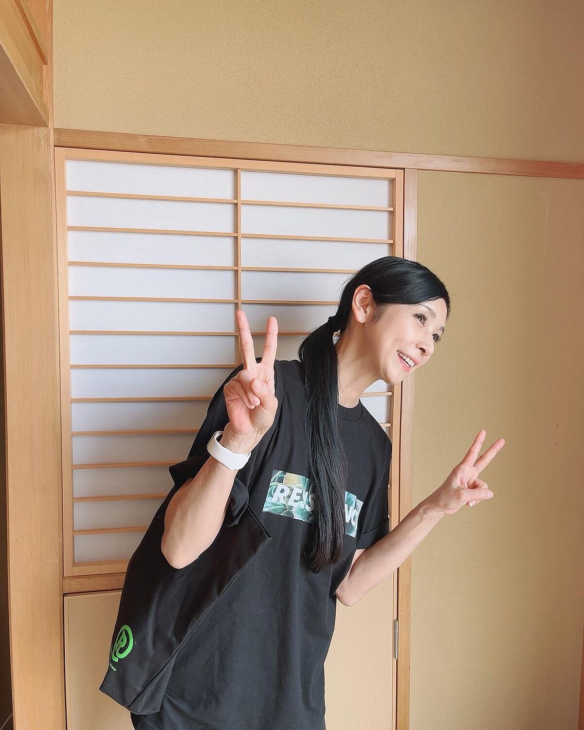 綁著低馬尾,黑木瞳穿著一件黑色的Oversized T-Shirt,不說的話,根本看不出來她的真實年齡,袖口反摺的小細節,讓穿搭看起來更有型。