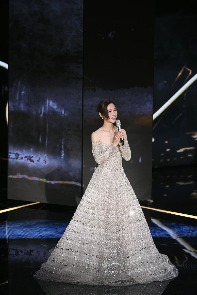 熱愛Bling Bling效果的謝盈萱,這件銀色水鑽禮服更是厲害,站在舞台上的她,燈光照射下閃閃發光,完美擄獲全場的目光。