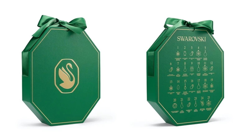 倒數月曆讓12月的每一天都像是聖誕節!2021迎來嶄新的八角盒包裝,Swarovski以聖誕樹綠呼應節慶氛圍,一共25 格驚喜藏於紙門背後,有聖誕水晶掛飾,也有擺飾,大部分皆為Hoilday限定款。