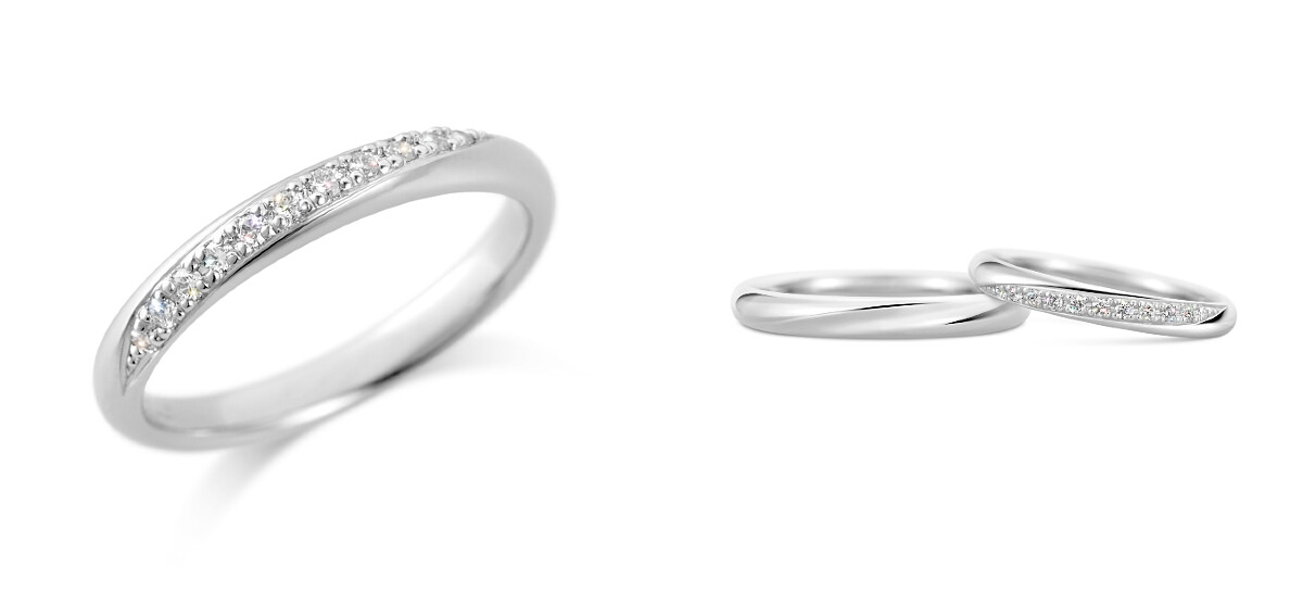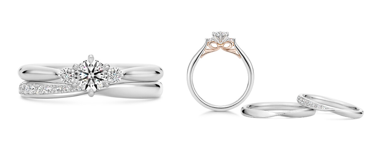 K.UNO Ribbon系列同樣也有結婚套戒的SET組合,與求婚鑽戒嚴絲合縫的完美契合線條,婚戒單邊戒環鑲嵌美鑽,使得疊戴的閃爍光芒更加強烈,單獨配戴婚戒也有一種別出心裁不對襯的時髦品味感。