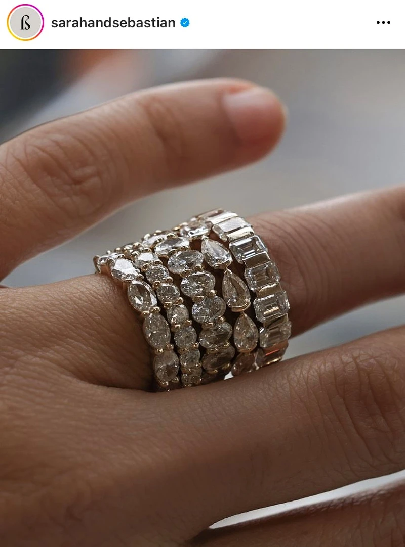 樣式為一整圈鑽石/寶石組成的永恆戒指,也越來越受到新人們的歡迎,根據珠寶商Sarah & Sebastian的觀察,更多客戶選擇永恆鑽石戒指取代傳統單顆鑽石戒指作為訂婚戒指,最受歡迎的是採用梨形或橢圓形等花式切割鑽石的永恆婚戒。Mejuri品牌首席創意總監Justine Lançon補充:這是一個更現代的經典選擇!永恆戒指更有日常配戴的意味,可以與任何單品疊戴,並帶來完美的光彩。