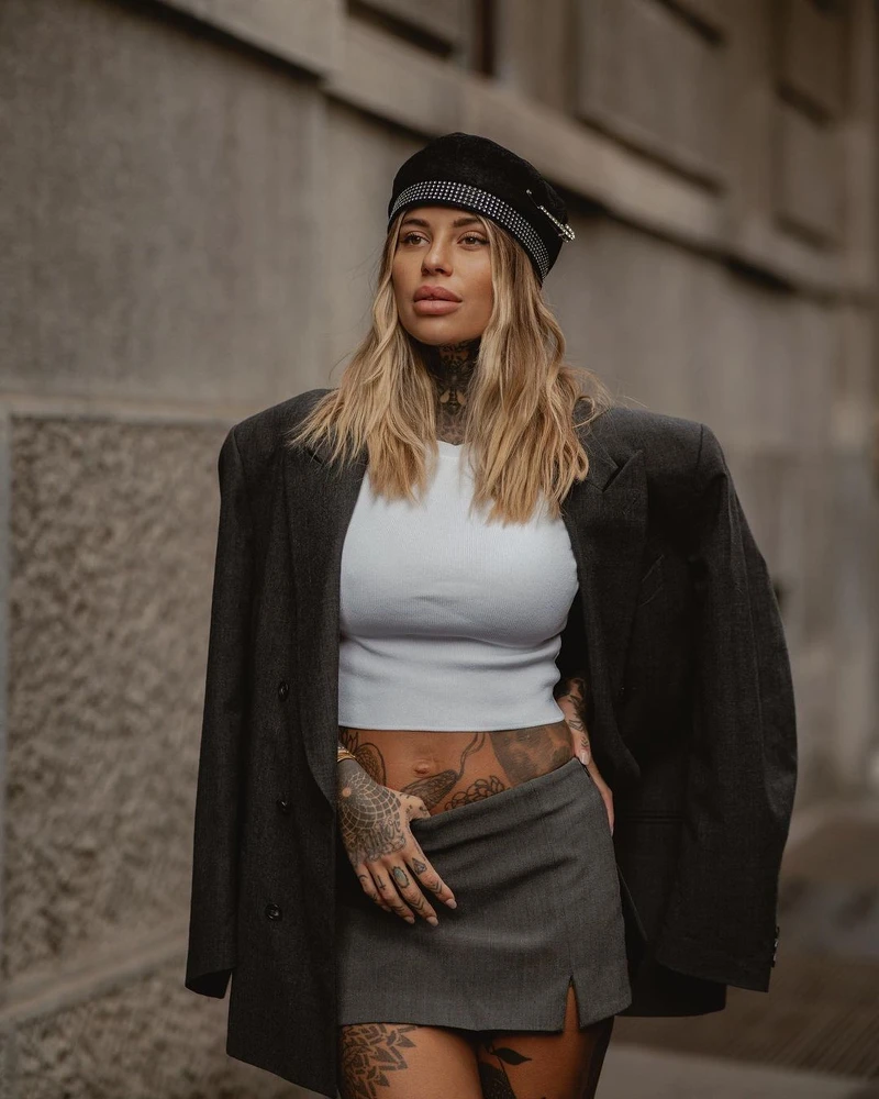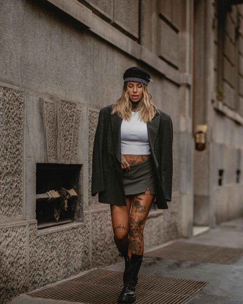 擁有人人稱羨的好身材,Zoe一點也不吝嗇展露出來,她的私服穿搭中,像是這套緊身白色短版上衣和灰色迷你裙,外頭罩上一件Oversized西裝外套,更露出一整片的刺青,整個人又性感又帥氣。